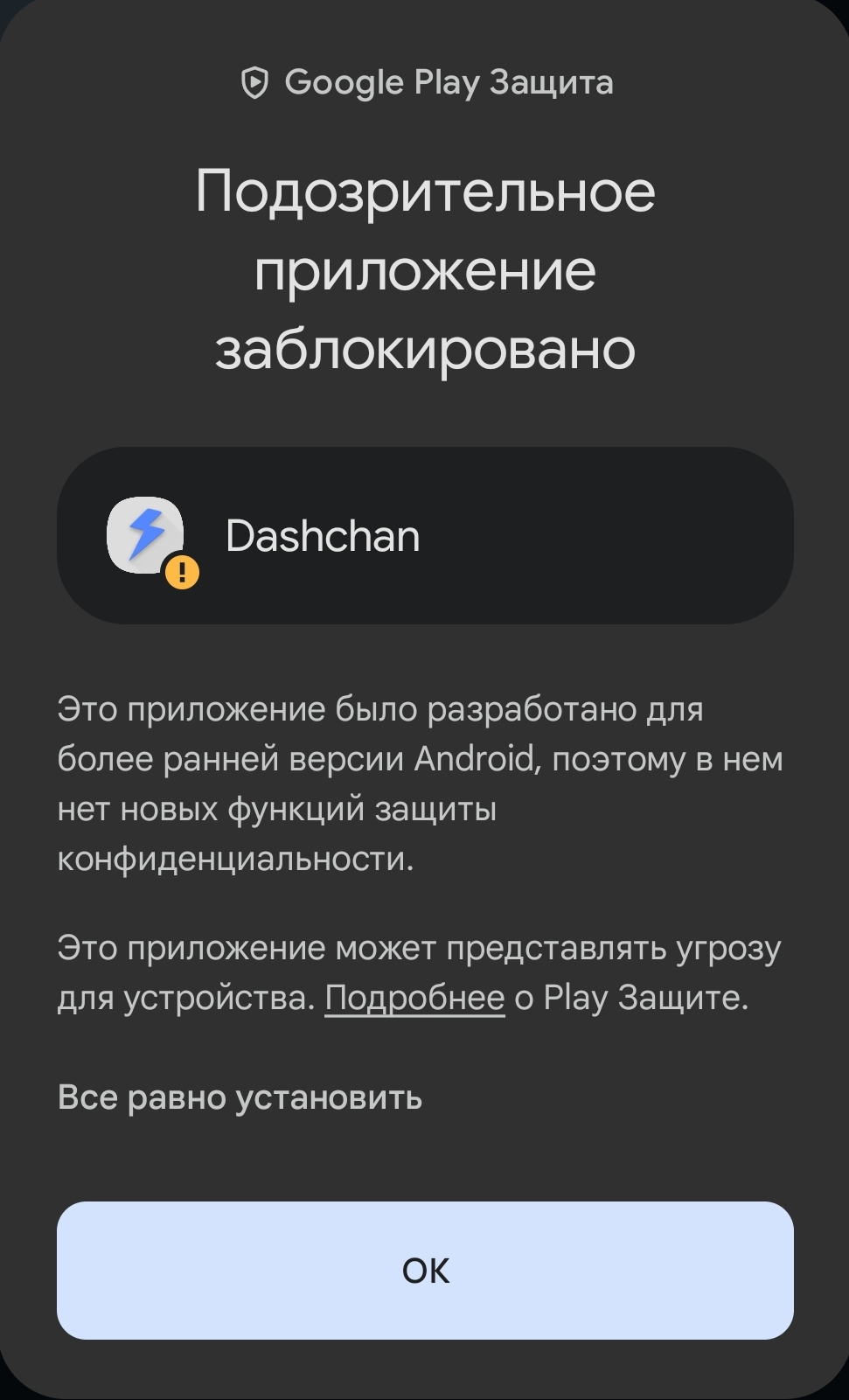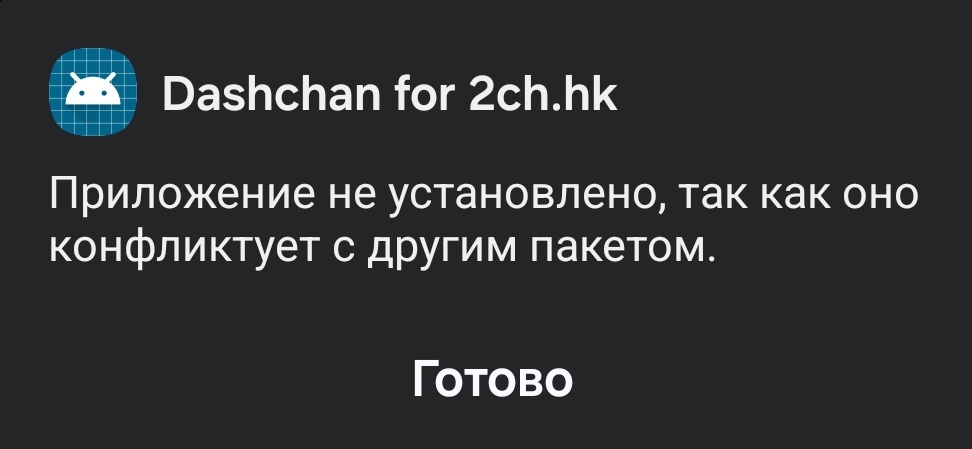 Устанавливать так: 0) На всякий случай делаете бекап закладок и настроек приложения ("Настройки" -> "О программе" -> "Резервное копирование данных" в самом дашчане) 1) Закрываете дашчан 2) Заходите в настройки системы и там принудительно останавливаете дашчан (на всякий случай) 3) Удаляете оригинальное расширение "Dashchan for 2ch.hk" 4) Ставите эту мокропиську 5) Запускаете дашчан, при запуске говорите "доверять этому расширению" 6) Если слетели настройки / закладки, восстанавливаете их из бекапа