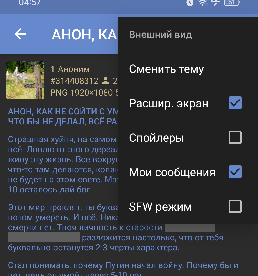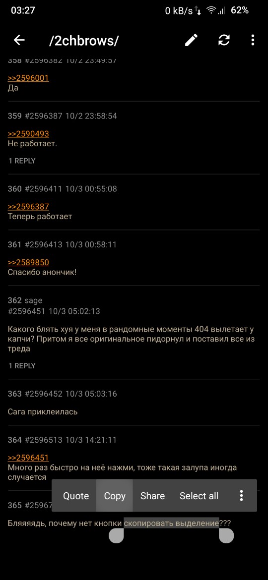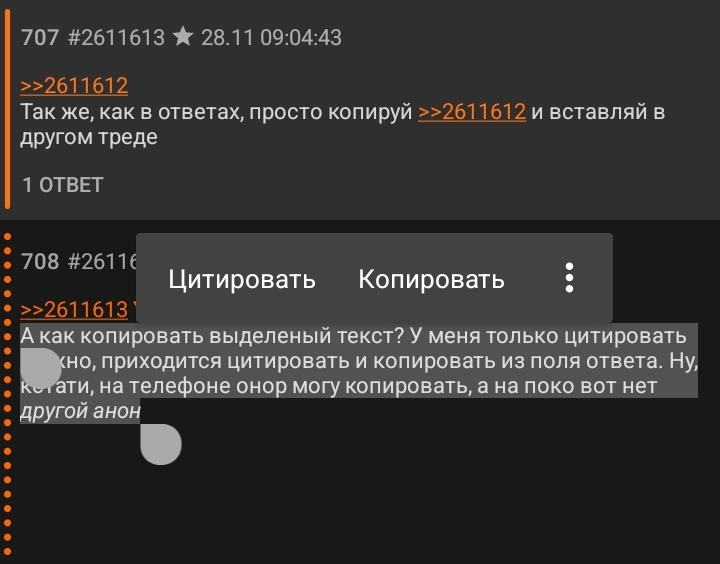 >>2611613 А как копировать выделеный текст? У меня только цитировать можно, приходится цитировать и копировать из поля ответа. Ну, кстати, на телефоне онор могу копировать, а на поко вот нет другой анон