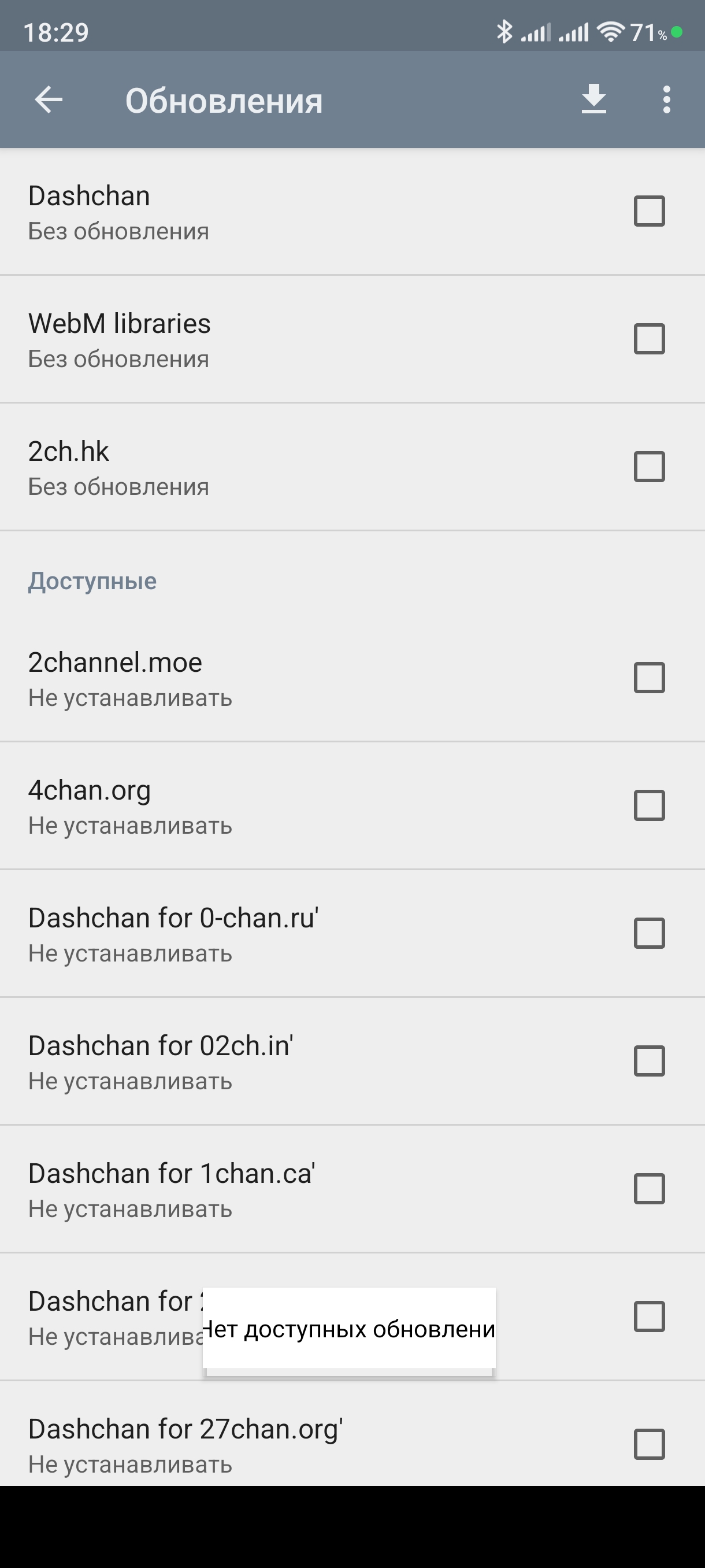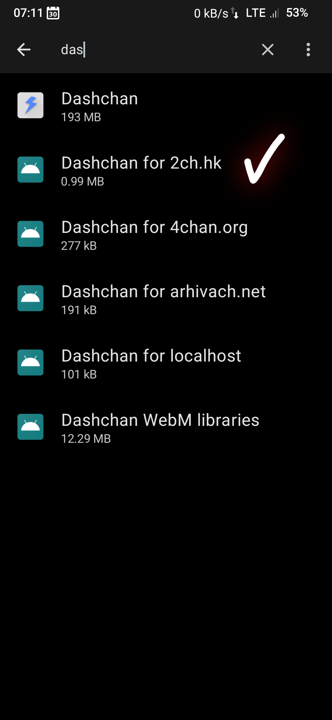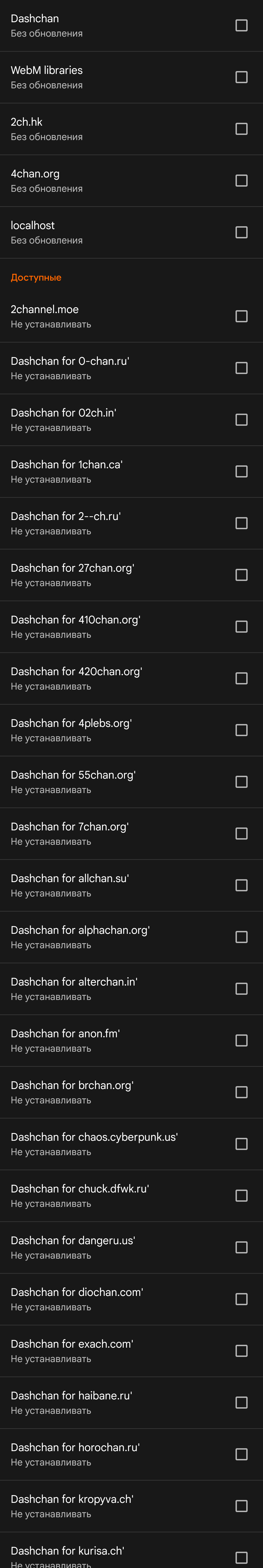 Dashchan - это клиент имиджборд для Android. Для поддержки имиджборд используются приложения-расширения, устанавливаемые рядом с клиентским приложением. Достаточно установить только клиент, после чего поставить необходимые расширения через интерфейс обновления, что клиент предложит сделать при первом запуске.
