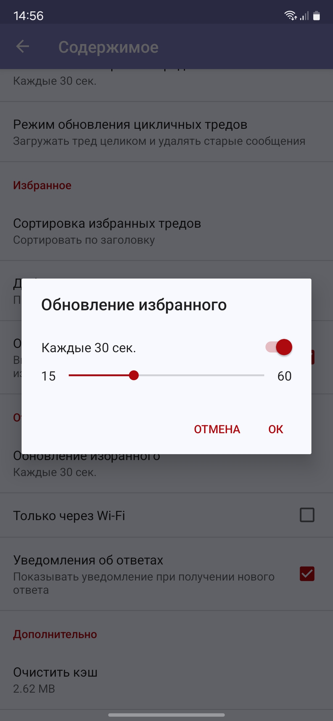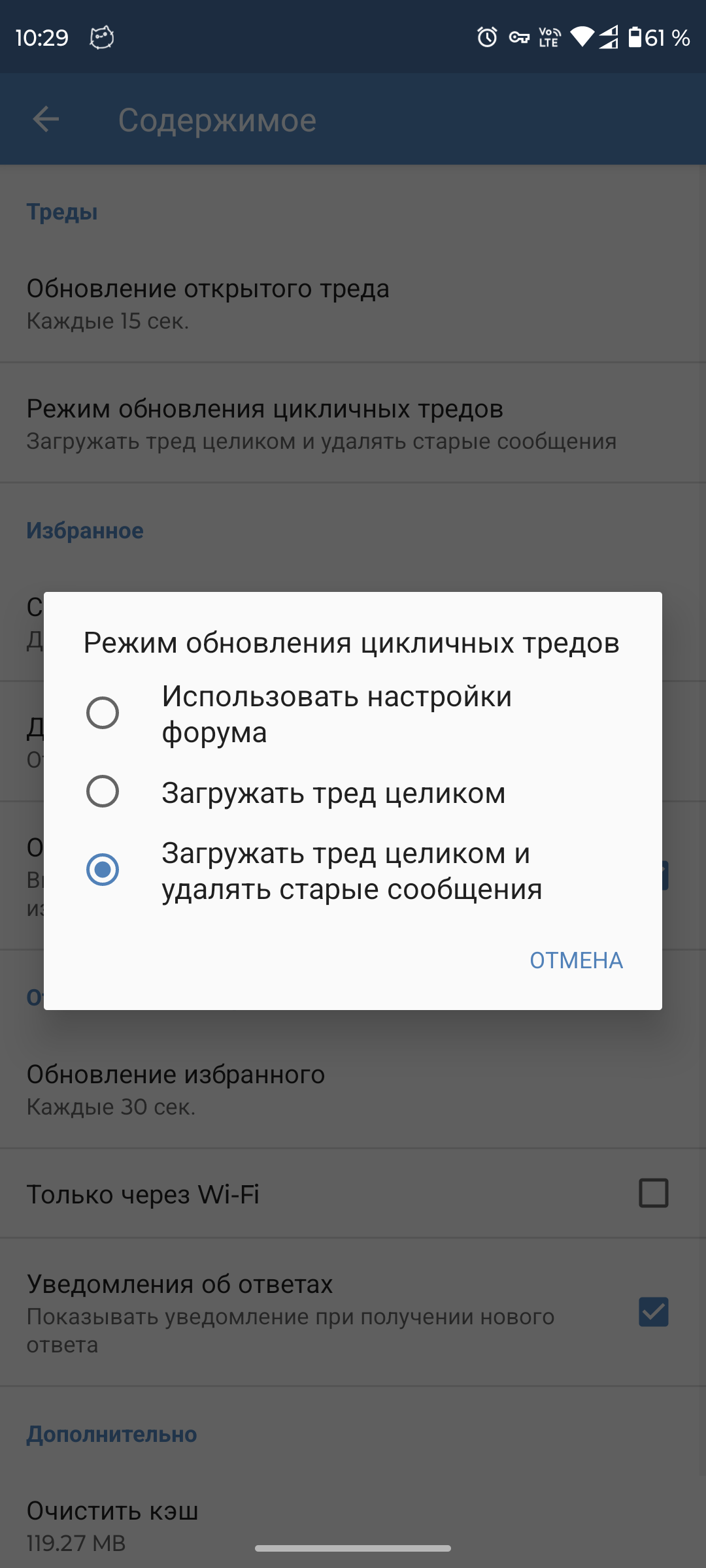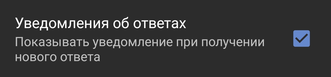>Как получать уведомления об ответах? Тред должен быть добавлен в избранное и для него должно быть включено отслеживание (нажатием на счётчик). Обновление избранного происходит только когда приложение используется (фонового обновления пока что не предусмотрено). Помимо этого, уведомления должны быть включены в настройках (Содержимое — Уведомления об ответах).