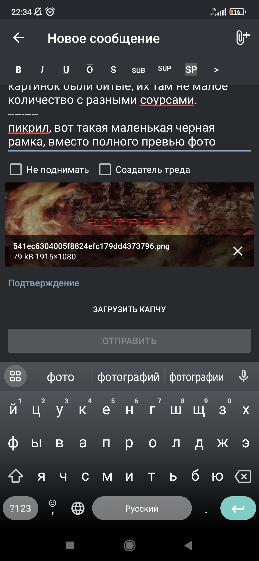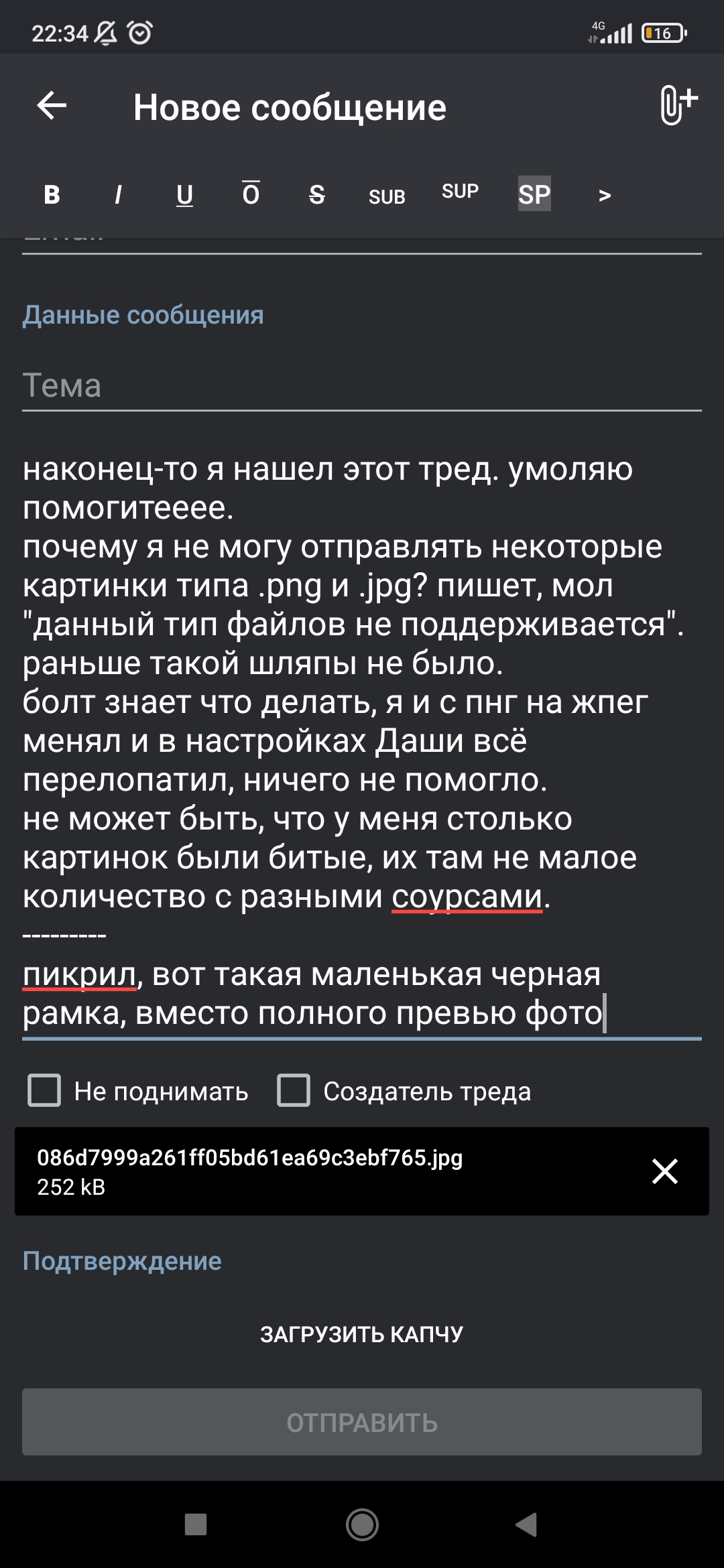 наконец-то я нашел этот тред. умоляю помогитееее. почему я не могу отправлять некоторые картинки типа .png и .jpg? пишет, мол "данный тип файлов не поддерживается". раньше такой шляпы не было. болт знает что делать, я и с пнг на жпег менял и в настройках Даши всё перелопатил, ничего не помогло. не может быть, что у меня столько картинок были битые, их там не малое количество с разными соурсами. --------- пикрил, вот такая маленькая черная рамка, вместо полного превью фото