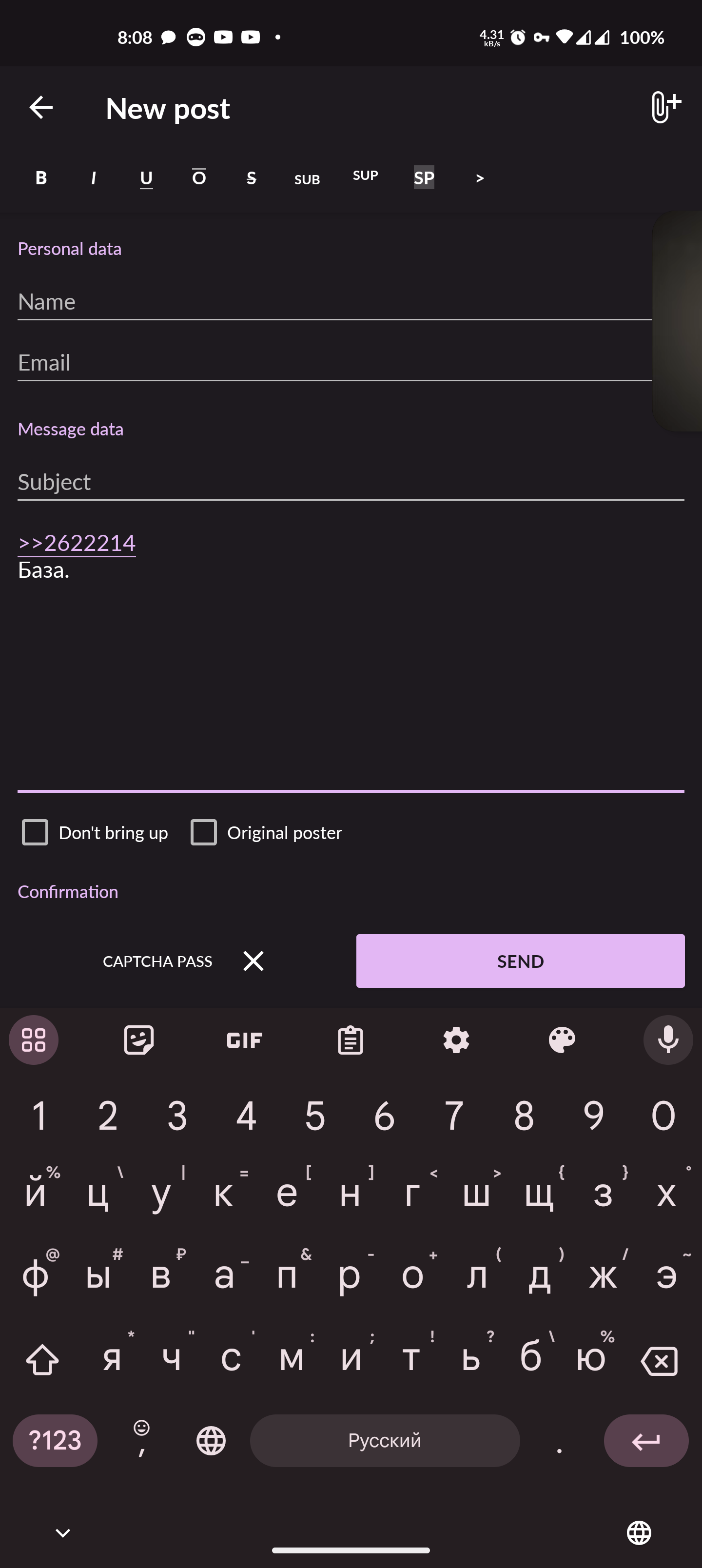 У меня сейчас пасскод слетел, есть какие-то рекомендации как пофиксить? Что-то в треде читал что надо ввести пасскод, а потом удалить и всё будет работать, но либо я что-то делаю не так, либо совет уже не работает, мне продолжает выдавать "некорректный ответ сервера". Пасскод в порядке, с браузера всё работает. А без пасскода я не могу писать из-за своего ip (нет, vpn не вариант).
