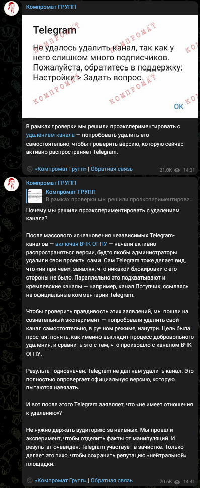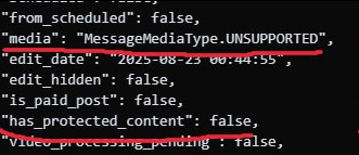 >>2665787 Не правильно выразился, поправлю себя. Подобной хуйнёй страдают каналы у которых стоит "защита контента", и не важно принадлежит он им, или же нет. Подобный функционал можно выставить в настройках самого канала и чата. Данный функционал появился давно, в году так 2021-м. https://telegram.org/blog/protected-content-delete-by-date-and-more/ru?ln=a#zaschita-kontenta-v-gruppah-i-kanalah Проще говоря, если же в группе будет выложено видео, фото или же гиф или же ещё что-то, и ты захочешь это скачать, или даже полностью сделать экспорт чата/канала, а в канале и в чате будет включена "защита контента", то у тебя не получится скачать вышеописанные вещи, тоже самое касается и пересылки. Но, если же канал выложит архив, то ты, вроде как сможешь скачать, но вот переслать его из канала не сможешь.