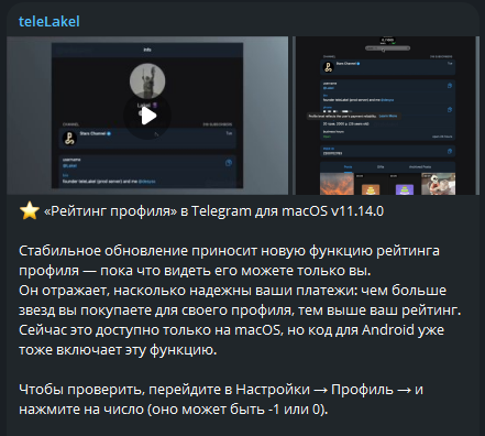 Я не знаю, почему сюда это до сих пор не скинули, так как это показывает всю внутрянку Telegram, и во что именно сейчас превратился Telegram. Кидаю картинками, так как, автор случайно поломал URL-картинок, и они не грузятся. (находится лишняя косая черта, и из-за этого не загружается большая часть картинок. Но исправляется это очень просто, достаточно нажать ПКМ на саму картинку и выбрать там перезагрузить изображение/reload image)