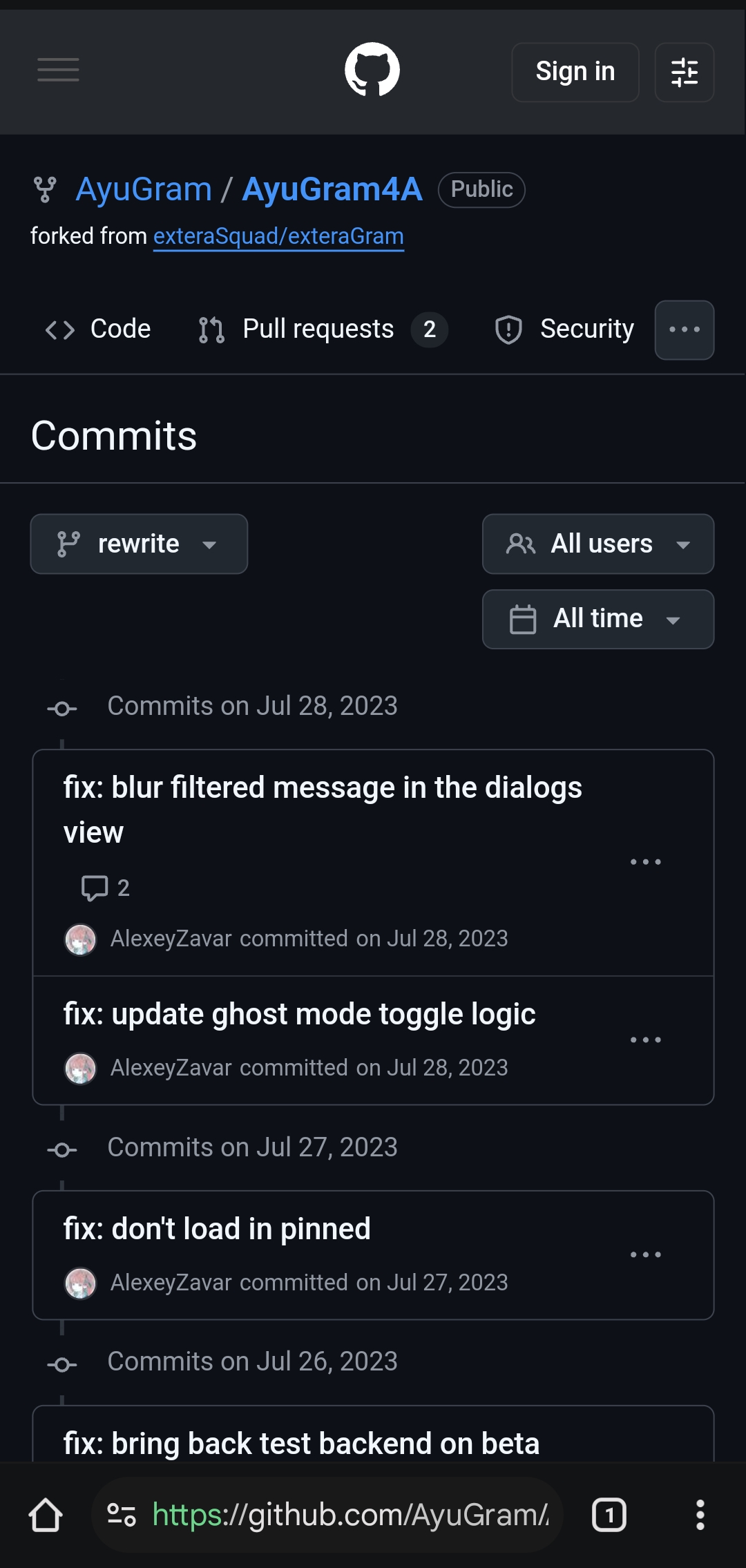 >>2669736 > Качай его, потести Ты имеешь ввиду exteragram? Просто тут я тоже не уверен. У них в телеграме выложено на версию вперёд, в отличии от гитхаба. Сомнительненько довольно.