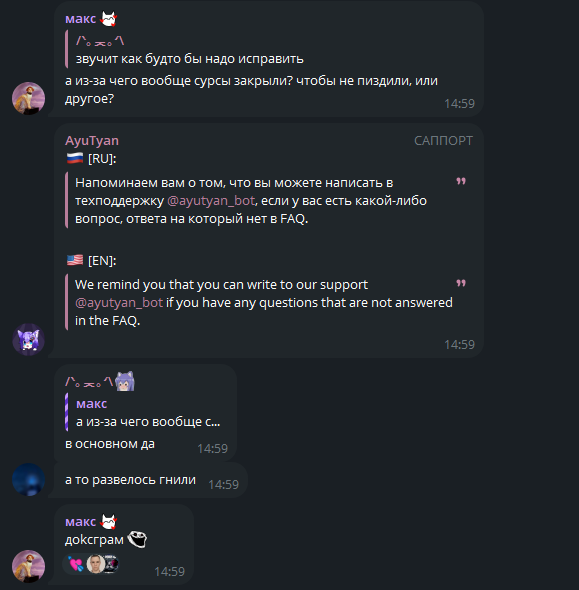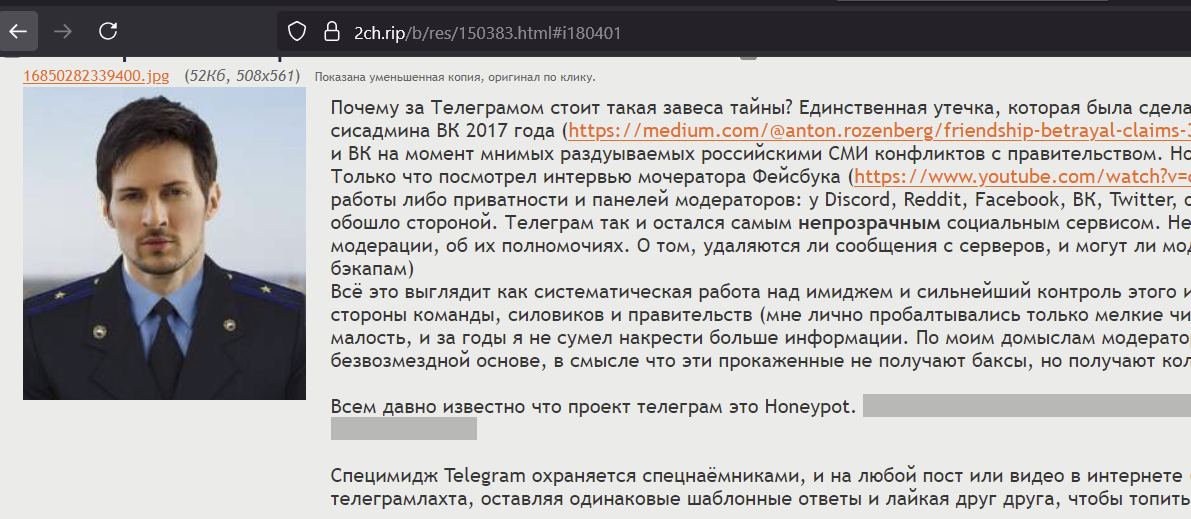 Произошла утечка сообщений пользователей Telegram, которые обращались в службу поддержки волонтеров, среди кучи сообщений можно найти как забавные, так и сообщения которые содержат конфиденциальную информацию. Данная утечка произошла на неделе, и Telegram поняв насколько они обосрались, начали удалять как сами посты содержащие tg_appeals.txt (да, так и называлась данная утечка), так и каналы которые выкладывали данную утечку, и не важно, что данные каналы могли содержат дохуя подписчиков. Если же вы хотите ознакомиться с данной утечкой, милости прошу, скачать её можно прямо здесь https://www.upload.ee/files/17791197/tg_appeals.txt.html