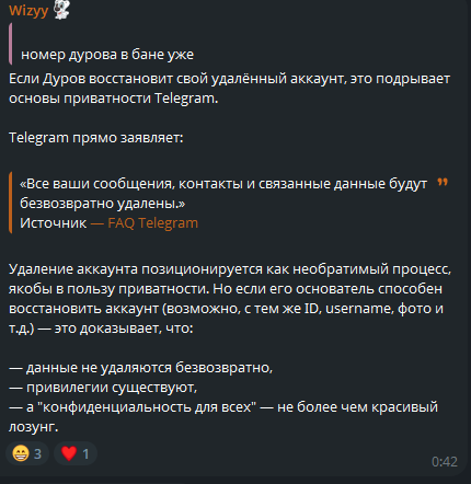 ⚡ ПРАЗДНИК В Telegram Аккаунт Павла Дурова был удалён. Да, именно удалён — потому что кто-то сумел угадать код входа и отправил запрос на удаление. Вероятно, он не заметил этого из-за потока спам-кодов.