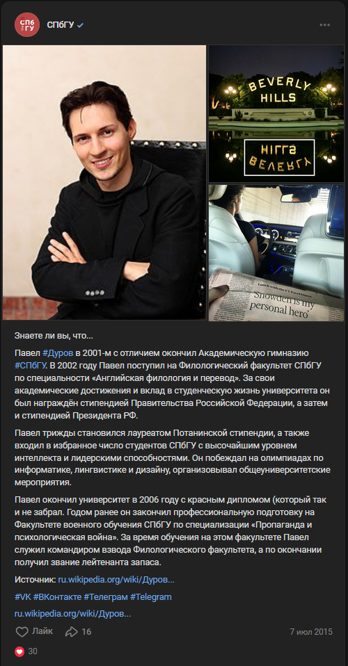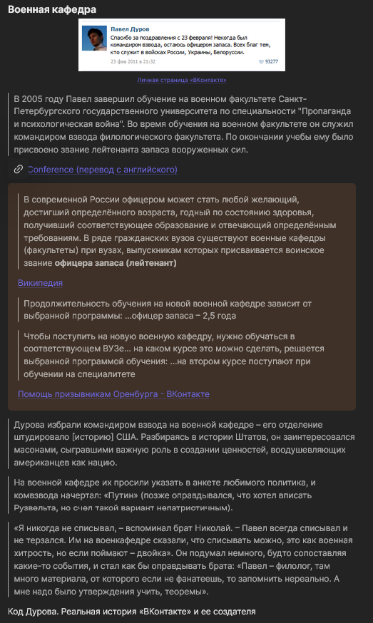 >>2685112 >А на какую специальность должны брать филологов? Как дуролахта резко поделила все свои дальнейшие слова на 0. Дальнейшее я даже не читал, мне просто дурно становится. Ты хоть знаешь, что такое ВФО/ВУЦ или как проходит туда отбор? Или что это вообще такое? Я вижу что нет. Иди проспись, малыш. И да, твой любимец - Паша Дуров, которому ты чуть ли не готов сосать, добровольно пошёл в ВФО, и учитывая сколько всего он делал, в то время для СПбГУ, я могу с высокой вероятностью тебе сказать, он скорее всего выбирал себе специальность, и ему выделили там место. И да, если бы там допустим каждый второй учился, или даже каждый первый, то какой нахуй смысл, удалять такую пустяковую информацию из вики, для чего? А точно, великий "проект Telegram". Зачем какого-то пугать такой информацией, что "великий освободитель и рэволюционэр" Павел Дуров учился на военной кафедре по специальности "Пропаганда и психологическая война". Люди просто не пойдут в мессенджер с таким создателем, следовательно, что нужно сделать? Эту информацию — удалить.