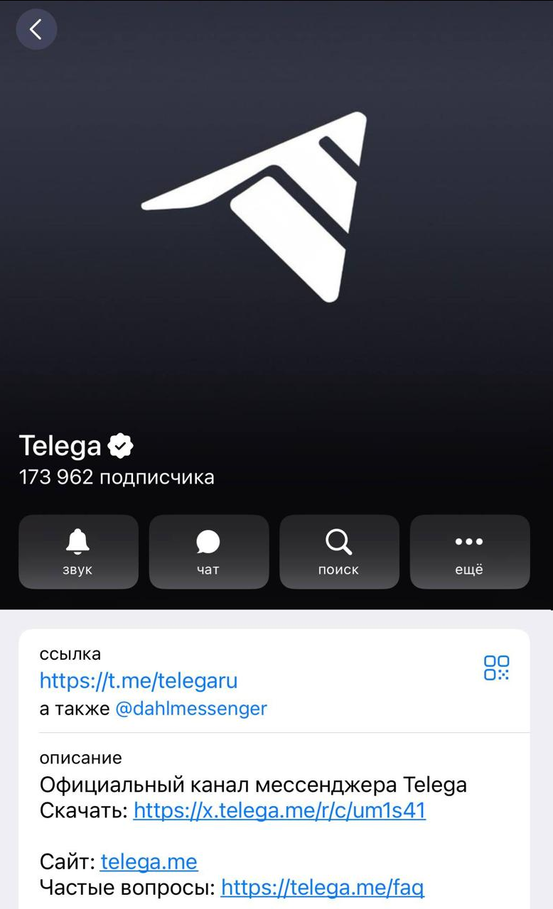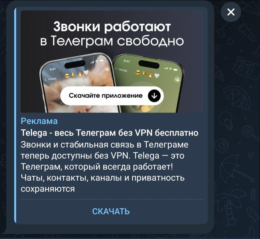 Ещё из интересного — Telega спокойно откручивает рекламу в самом Telegram. Кроме того, у клиента есть официальный канал (https://t.me/telegaru), даже с галочкой.