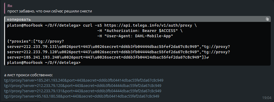 >>2687130 Только один раз для регистрации, после чего тебе не будут приходить СМС коды, т.к, телега отказалась от постоянной отправки СМС кодов, потому что для них это дорого. Здесь же всё наоборот, тебе будут приходить коды даже в том случае, если у тебя регнут аккаунт. И как я писал ранее, такой функционал незадокумнтирован в API телеге. Как они это сделали? От Фаниса слышны различные маняоправдания и различные попукивания "ну мы типо там это..." >письмо на почту Вот именно, когда у тебя уже регнут аккаунт, и привязана почта, тебе будут приходить: 1) Коды в само приложение 2) Коды на почту. А вот смс тебе не будет приходить, для телеги это дорого. Бывало даже такое, что телега сразу отказывала присылать СМС при реге в тот или иной город, так как для неё это было дорого, и предлагала сразу привязать тебе почту, чтобы прислать туда код. Можно найти кучу пруфов в инете. И да, как ты будешь коупить данный скриншот? Это прямое нарушение ToS и API. >>2687131 > вижу настроки для клиента сервиса звонков от ОК Здесь дело не в "настройках клиента сервиса звоноков от ОК", а в том, что они выпилили прокси адрес, о котором начали везде говорить, а именно dal.mvk. Вот тебе для наглядности 2-й пикрил, как это ранее выглядело, если тебе так лень перейти в самый первый пост, и перейти в те ссылки, и уже там посмотреть скриншоты. Но учитывая, что данный домен уже выпилен, а он использовался для прокси, им пришлось прибегнуть к более изощрёному методу, а именно ко встроенному прокси ТГ, но пользователи всё равно нашли их. (3 пикрил, прокси лист был вытащен из последней версии Telega) И если посмотреть где они хостятся, а хостятся они все исключено на мощностях VK (VK Tech, VK Cloud), то всё снова встанет на свои места, а все последующие слова Фаниса звучат очень и очень смешно.