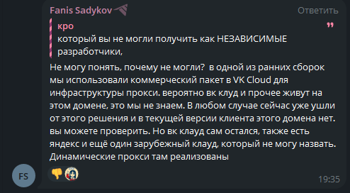 >буквально на виду используется внутренний сервер ВК (dal.mvk), и так же прокси который крутится на VDS/виртульном сервере ВК Ну, да, ну да. Не планирует, и не занимается "какими-то схемами", ты сам-то в свои слова веришь? Он сам лично пришел с обосранными штанами в чат, где это было опубликовано, и начал оправдываться, и своими же словами начал себя ещё сильнее закапывать. Он больше 10 минут не мог ответить зачем они используют чужие номера на бэкенде, и так же, зачем и как отправляют СМС, если в API телеге такого функционала - нет. Это же смешно. >этот клиент телеги тоже не был замечен за плохими действиями Вiрю, я поверiв. Мамой клянёшься? Ты мне сначала ответь, откуда у такой маленькой команды, деньги на рекламу когда в свою очередь, реклама в самой телеге стоит баснословных денег, откуда у них деньги на SDK VK, которая стоит тоже немало, и также почему их виртуальный сервер с проксями до сих пор не закрыл VK, если они предоставляют по сути своей услуги VPN? Не ответишь на эти вопросы? Или будешь также мычать как Фанис? >Ты этого не знаешь, во-первых. Я эти клиенты видел, мне этого достаточно. А вот что касается тебя, то да, ты этого не знаешь, и я могу просто процитировать твои слова: >Твоя аргументация крайне хлипкая. Надо смотреть на факты, а у тебя фактов нет, тупо фантазии.