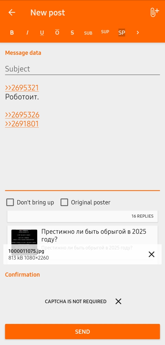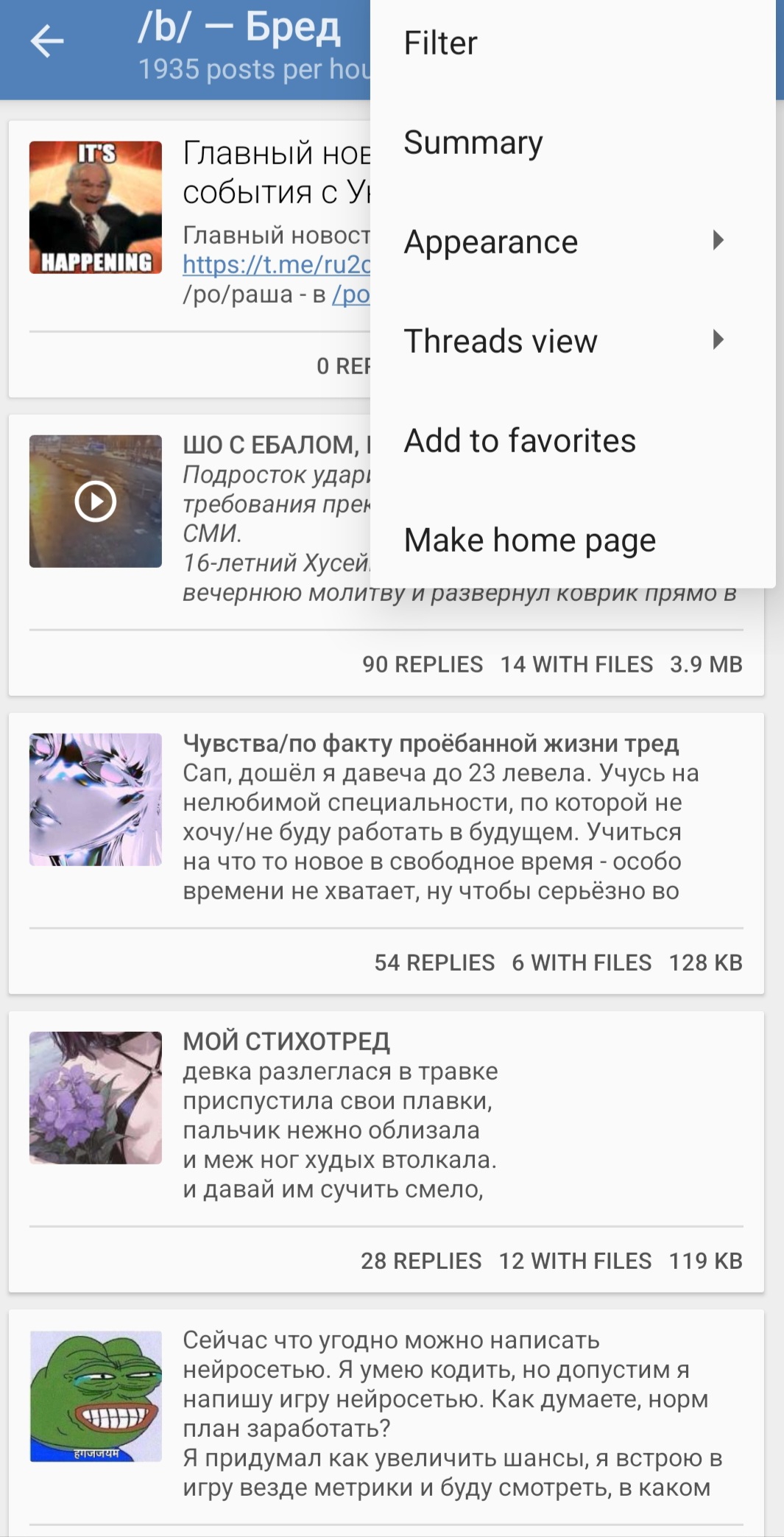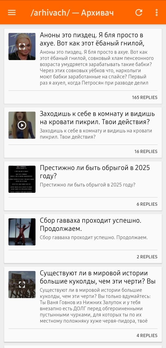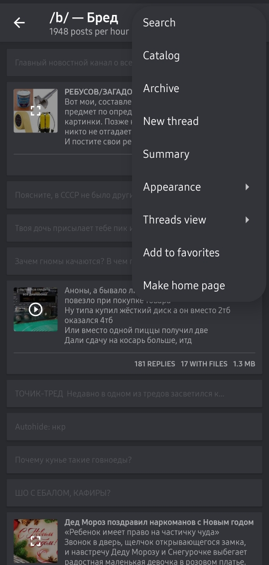 По просьбам трудящихся вкидываю свою версию дашчана, ориентированную на 4chan, со следующими особенностями: Экран открытого треда: - Возможность "авторизоваться" через письмо с почты. Для этого самостоятельно переходим на https://sys.4chan.org/signin, запрашиваем там верификацию, находим на почте ссылку https://sys.4chan.org/signin?action=verify&tkn=* и копируем в буфер обмена. Далее заходим в любой тред 4чана, нажимаем на "...", в меню выбираем "Подтвердить E-Mail", в появившемся вебвью делаем всё что от нас просят и выходим только тогда, когда появится зелёная надпись об успешной привязке. - Получение тикета для загрузки капчи. С недавних пор сама по себе капча загружаться перестала, а автоматизировать все редиректы я не осилил, поэтому в той же менюшке треда есть опция "получить ticket". Нажимаем, видим вебвью с загруженным 4chan.org, руками открываем любой тред на любой доске и что-нибудь там постим. Если сразу перед этим привязали почту, то ждать придётся 60 секунд, в противном случае - 900, и то не факт что в результате прокатит. Когда запостили и убедились что пост отправился, через пару секунд выходим из вебвью. Всё, после этого капча должна грузиться штатными средствами. - Слайдер/SeekBar для капчи. Добавляет ползунок для двиганья задников капчи, что гораздо удобнее изначального выбора среди 9 вариантов. Попытка сдвинуть ползунок до того, как капча прогрузится, приводит к крашу приложения. - Автоматическое решение капчи. Пытается решить капчу с помощью стороннего приложения по ссылке https://github.com/K1rakishou/4chanCaptchaSolver. Раньше решал почти всегда, сейчас "новым" юзерам даются новые всратые варианты, но если вас не банили несколько дней то можно попытаться активировать опцию. Для работы нужно установить вышеупомянутое приложение и включить соответствующую опцию в настройках плагина 4чана. - Цитировать всех. Отвечает на каждый пост в треде. Сейчас такие посты не пропускает ни на форче, ни на сосаке, на какой-нить мелкоборде возможно и прокатит. - Экран написания поста: - Обойти фильтры. Рандомно меняет русские и английские символы на их внешне похожие аналоги. - Удалить имя файла. Отличается от оригинала тем, что выставляет 16 цифр вместо 13, опять же для соответствия формату 4chan'а. - Перекодировать. В отличие от оригинала рандомизирует пиксели в процессе перекодирования, таким образом можно избежать автоскрытия и нахождения ваших постов в архиве по хэшу. Стандартная опция "уникальный хеш" там не работает, но я не стал её трогать. Избранное: Теперь отслеживаемые треды помимо количества непрочитанных постов показывают номер страницы, на которой находятся. Пригодится, когда нужно бампать тред и не давать ему утонуть.
