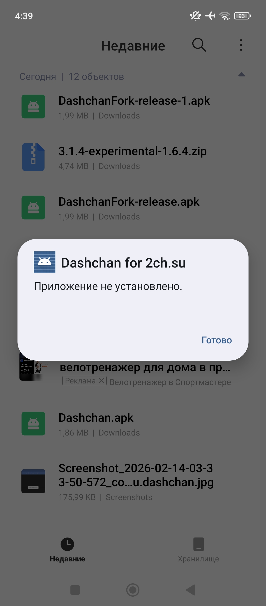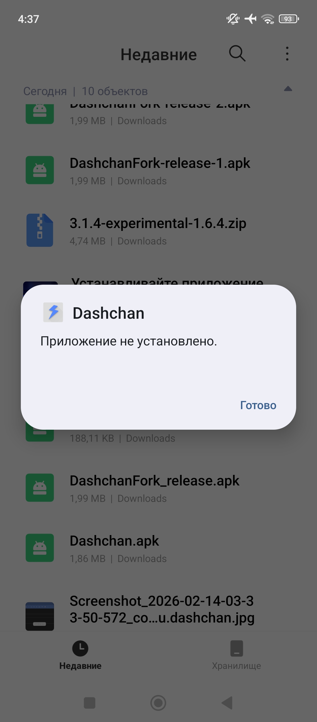Снёс оригинальный Дашчан, в котором перестал работать пасскод. Хотел поставить форк. Не ставится, несмотря на принуждение. Оригинальный устанавливается, но на оригинальный теперь не ставится двач.