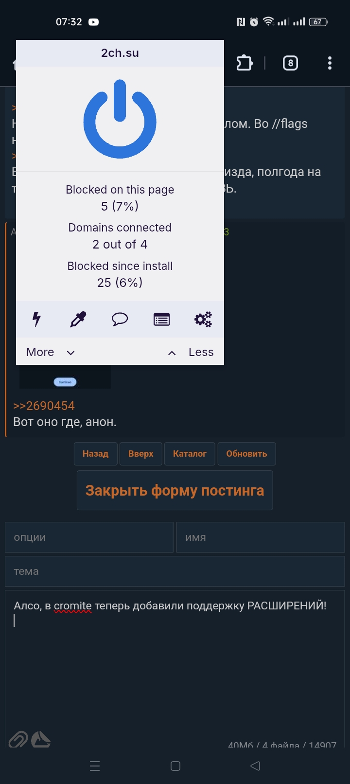 >>2685590 > А чем сейчас пользуешься, пока ждёшь? Firefox. Мне в нем очень нравится что можно открывать ссылку в приложении долгим тапом, а не просто установить по умолчанию открытие в приложении и главный экран с недавно посещенными страницами. Но чувствуется что не такой шустрый как хромиум браузеры, но на мощных телефонах это не особо заметно. > Так киви же был. Я им пробовал пользоваться, но он мне показался не таким изящным из-за иконок вроде или из-за других каких-то решений. Не помню уже. Ну и ключевое слово что был. Я бы хотел что-нибудь похожее на Cromite, но с нормальным адблоком типа ublock origin или как в brave.