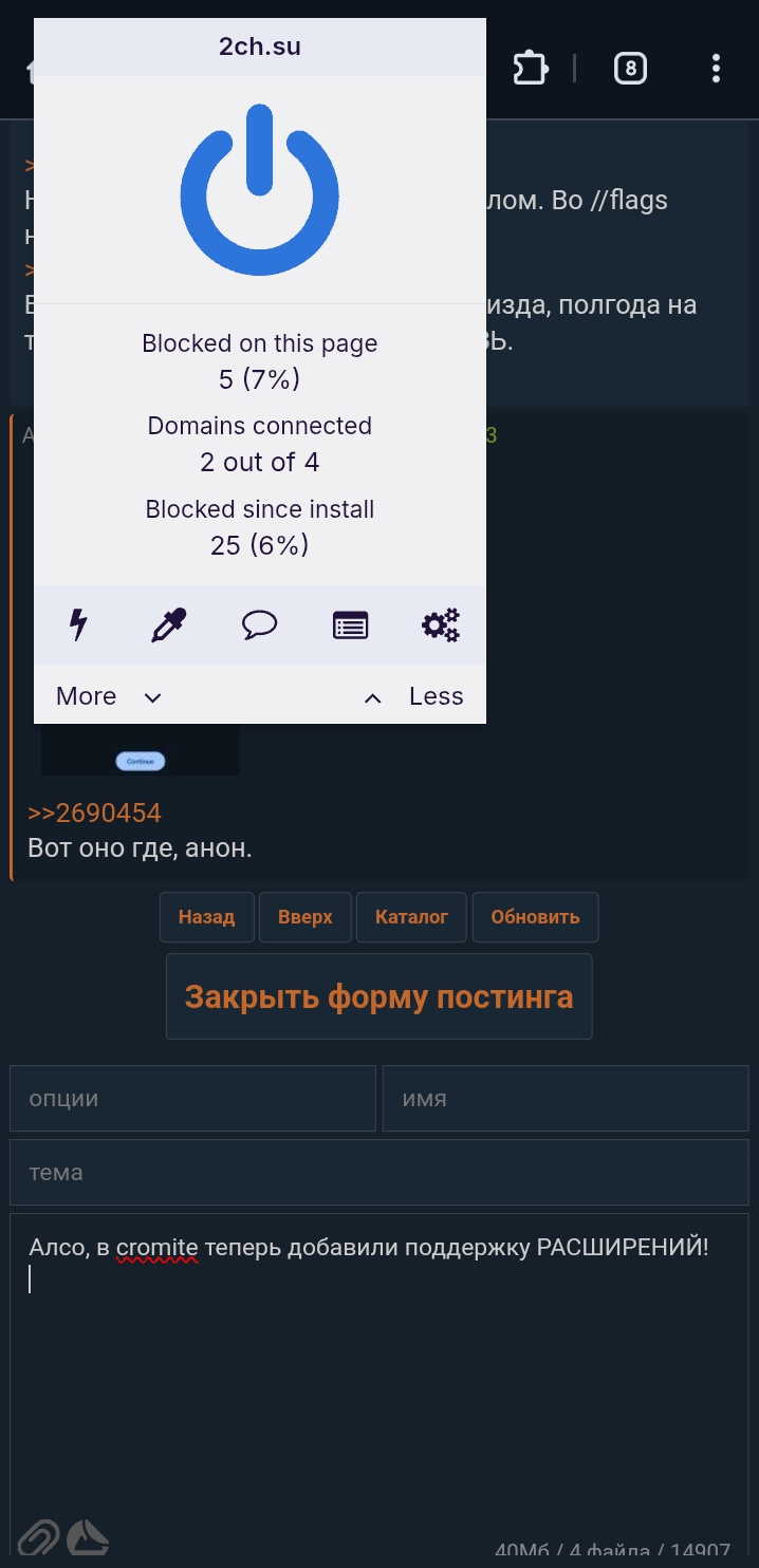 Если кому интересна современная замена Kiwi, то есть браузер на основе Хрома с поддержкой расширений, то трайните Ultimatum, есть на гитхабе и сделан русским челом. Довольно годная штука вышла, я накатил Ublock origin(да он поддерживает расширения 2 манифеста), скрипт для перехвата видосов во внешний Андроид плеер и кайфую. Единственное чего пока не хватает это кастомизации внешки(но этого не было даже на Киви), автор говорит что в некст версиях запилит кастом UI через скрипты как хочешь. В общем годнота для любителей Kiwi browser, рекомендую.