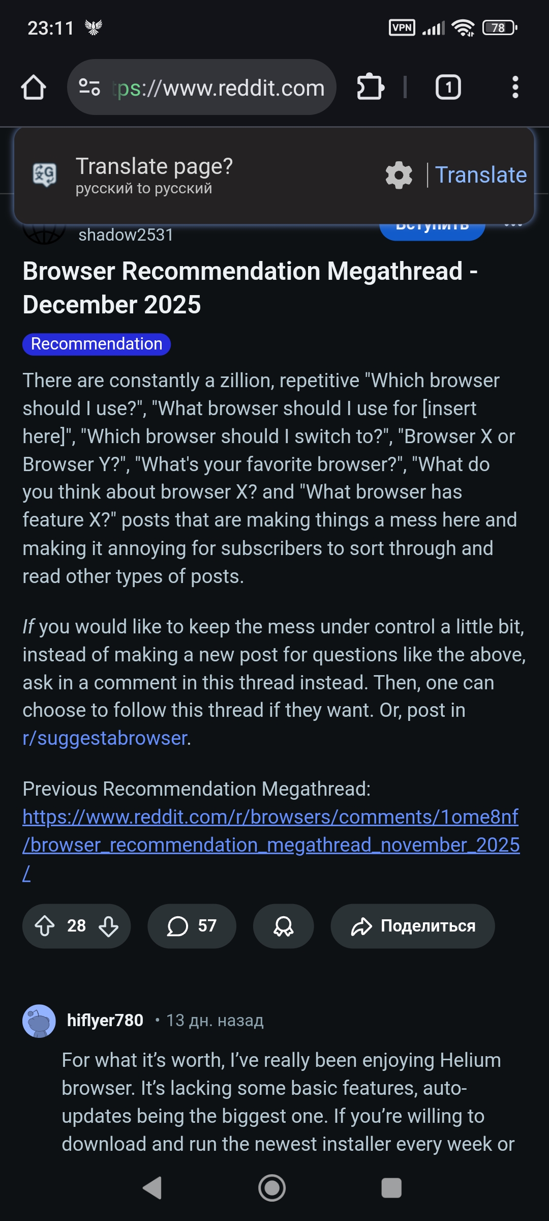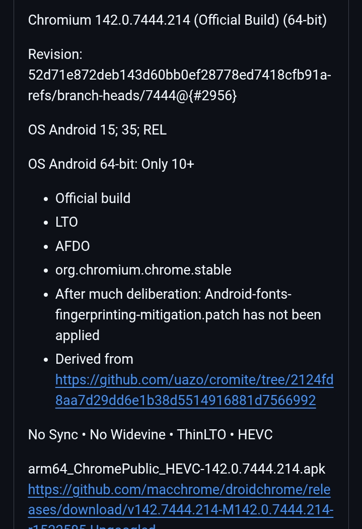 >А я типо не знаю думаешь?) А до этого обновления какой там промежуток был, не подскажешь? Обновы у него достаточно частые для таких приложений, 2 месяца это вообще хуйня ни о чем. У меня секьюрити патч от Гугла на Самсе последний доступный за сентябрь 2025, а это действительно важная хуйня причем официальная, а ты воняешь когда браузер 2 месяца не обновлялся, дохуище популярных официальных прог не всегда так же часто обновляются включая браузеры(тем более чел не просто версию хромиума повышает от обновы к обнове как ангуглед)