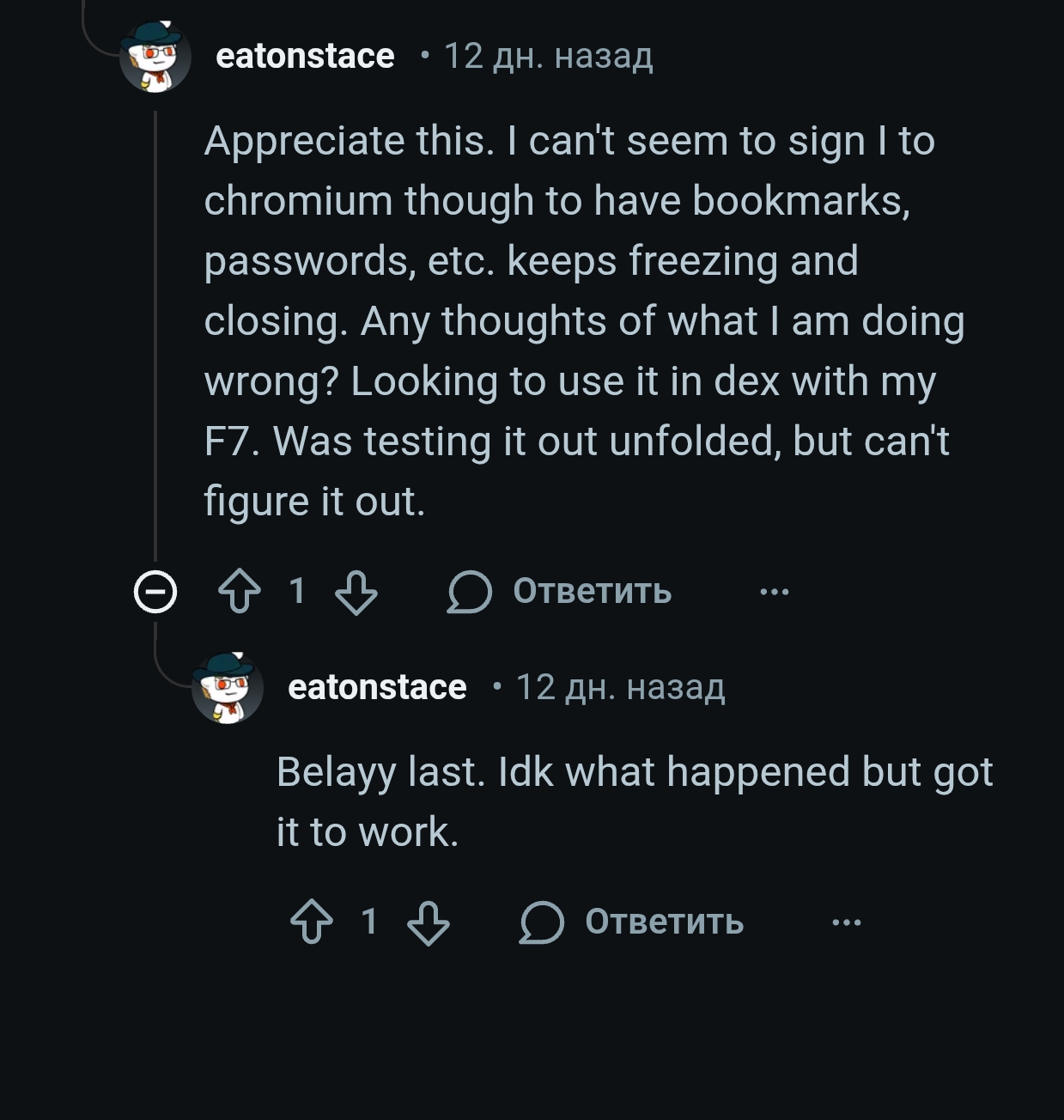 >>2674848 > На брейве тоже плохо грузятся сайты Тоже такую хуйню наблюдаю. При том только когда первый раз заходишь в браузер и открываешь любой сайт. Он будет грузится с задержкой. После этого все остальные сайты открываются нормально, как обычно. Раньше эта проблема была особо явна, но казалось будто ее пофиксили, хотя сейчас опять появилась. Кажется тут проблема в количестве фильтров в блокировщике, так как после сведения к минимуму, как по мне, скорости прибавилось, но баг все равно никуда не исчезает. >>2674835 Ну хз, у меня на iceraven получше ситуация, чем в обычной лисе. Оно и будет обновлять, будет похуже, чем в хромиумах, но все равно лучше, чем в дефолт фф. Вот допустим у меня на обычной лисе если выйти из нее, а потом зайти в телеграм, то по возвращению в браузер вкладка выгружается. На iceraven такого нету.