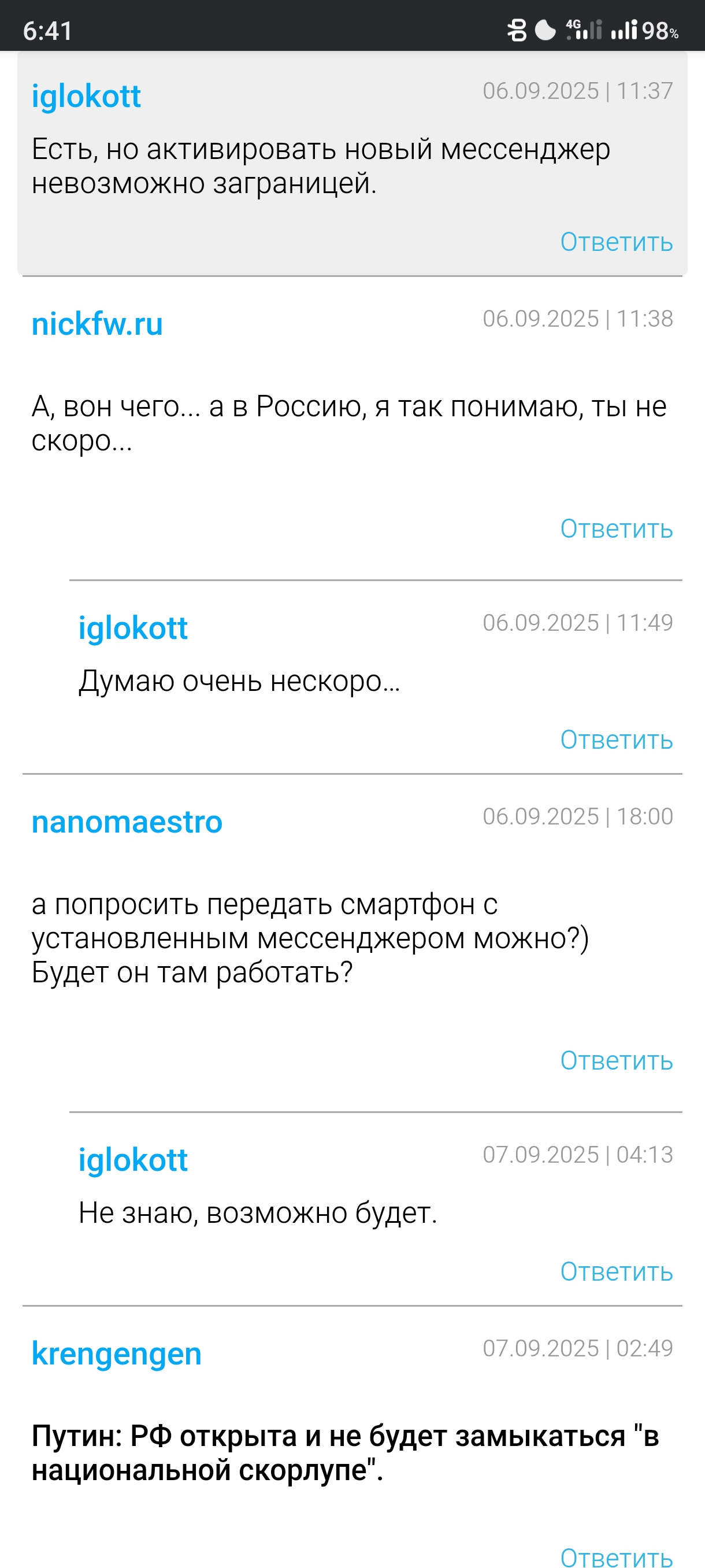>>2670643 (OP) Скачал MAX, читаю новости. Охуенный мессенджер, но не без недостатков. Его нужно ещё несколько лет допиливать, чтобы он вышел вровень с телегой. Не хватает плавности и скорости, ограничен функционал, звонки пока не тестил. Хотелось бы, чтобы в MAX была нормальная техподдержка, которая не будет откидывать акки и блокировать номера за сообщения в лс, а когда ты подаёшь апелляцию, тебя посылают нахуй или игнорят. Декстоп версией можно пользоваться. Я не могу удалить из чатов: избранное, чат бот и коды подтверждения, с помощью которых я вхожу в VK, ещё висит плашка, подключите контакты, бесит, надеюсь это пофиксят и у меня не будет ничего лишнего в профиле.