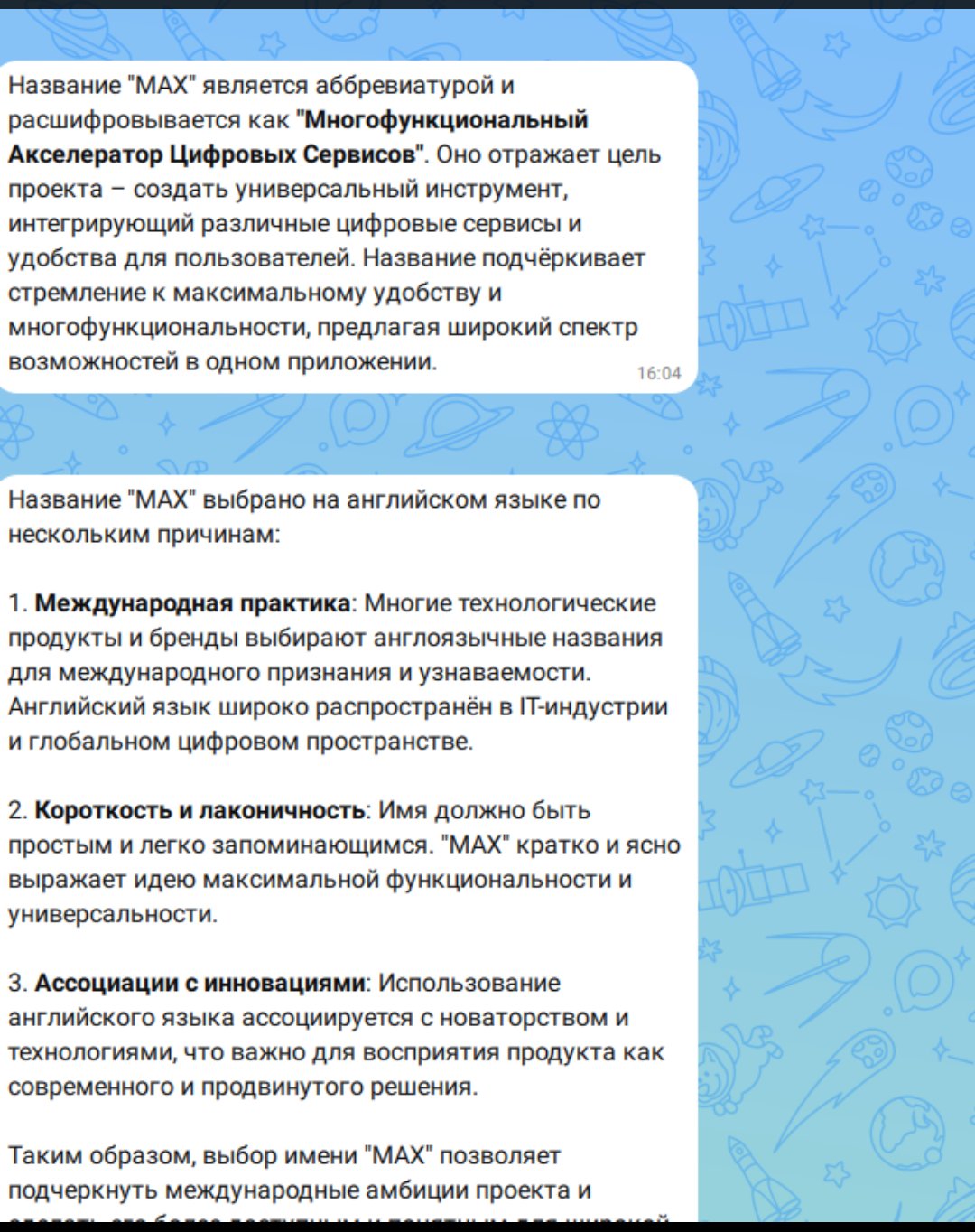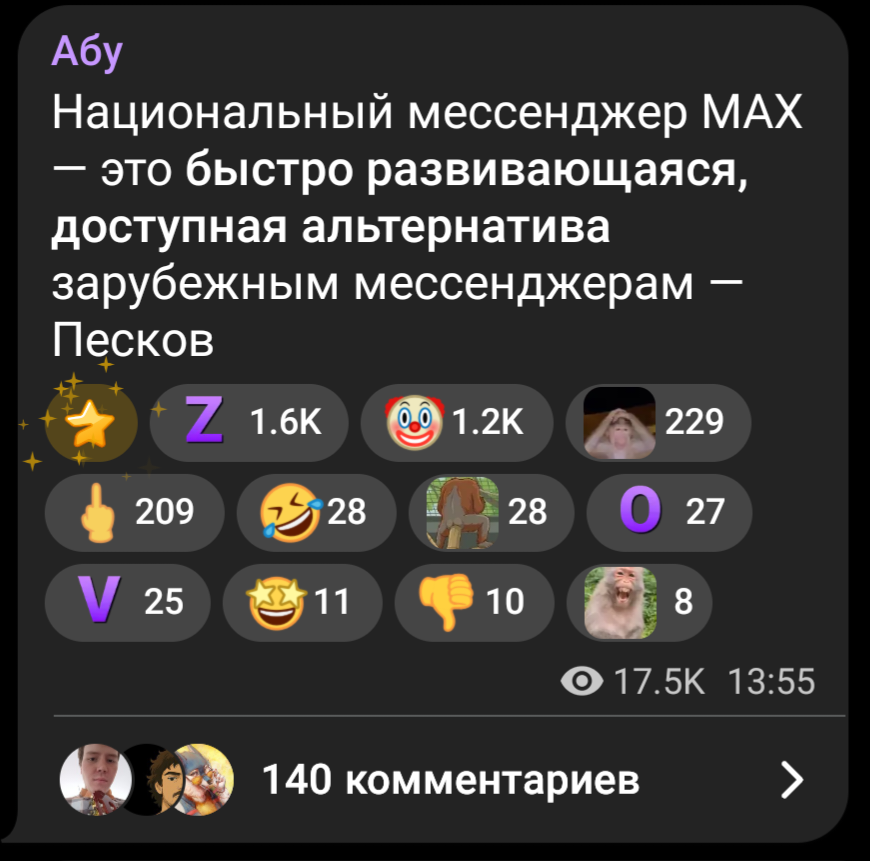 Мне не нравится, что разрабы макса практически всё копируют с телеги, что-то есть от вк, но было бы лучше, если бы его сделали более уникальным. Я понимаю, это для того, чтобы было легче переходить, так как многие привыкли к тг. Нет комментов, но они нахуй не нужны, ведь тогда долбоёбы будут писать хуйню. Было бы круто, если бы они не внедряли дохуище ботов как в тг, от них больше скама, чем пользы.