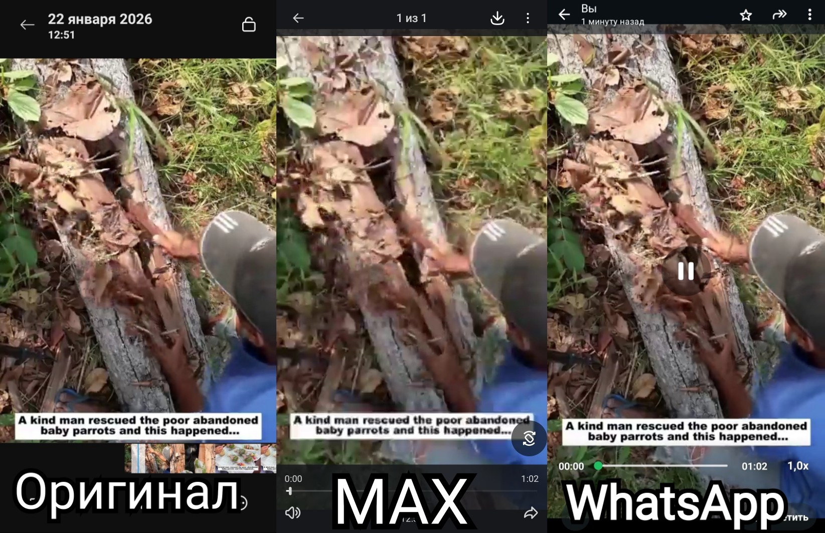 >>2706384 Вот так макс жмёт видосики, если отправить не файлом. Размер при простой отправке и этот же отправка файлом оригинал. По сути это во всех мессенджерах. Если файл уже пожали ранее, думаю мессенджер не будет его ужимать, там вроде у всех есть предел, чтобы не превращать картинку в месиво из пикселей.