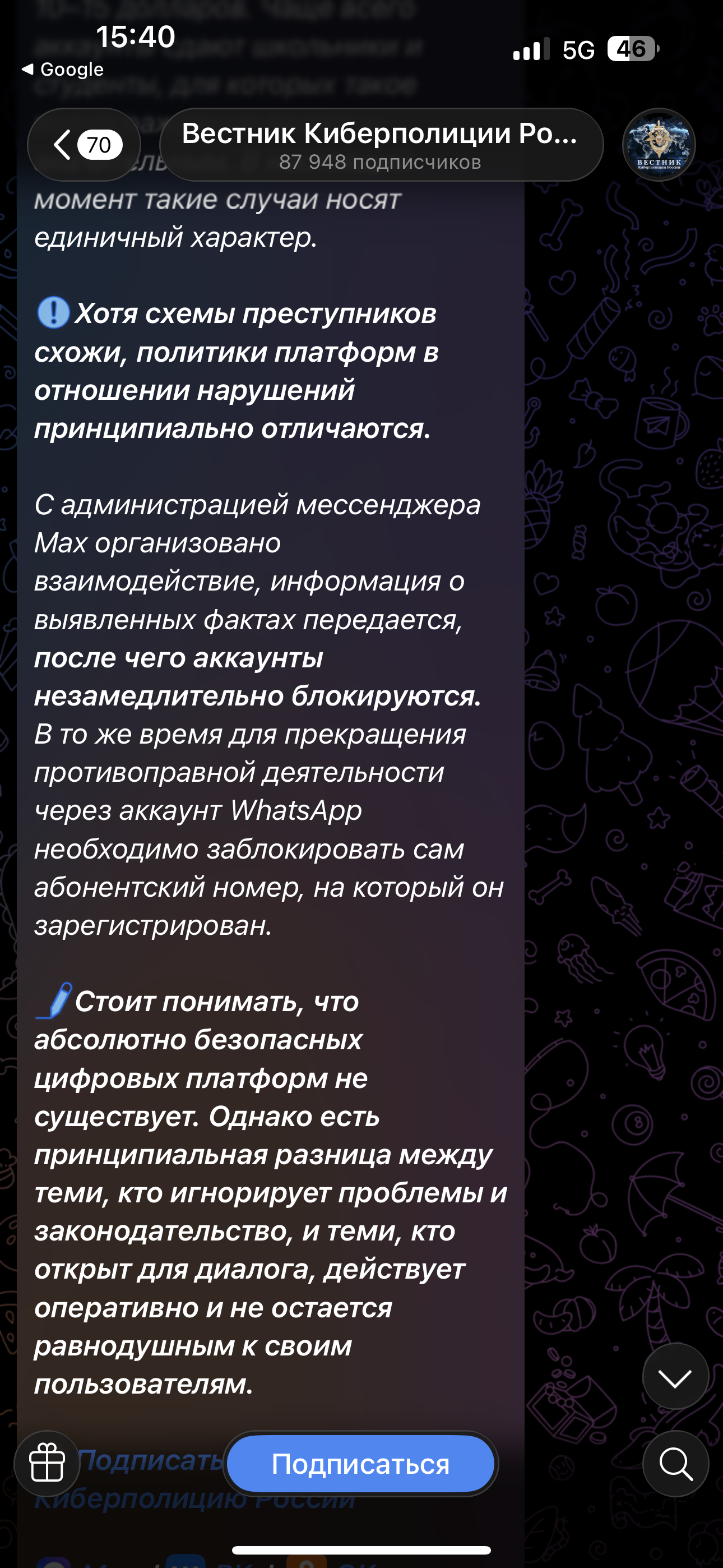 Не вижу ничего плохого в этом самом максе, особенно для общения с родственниками 60+ и местом под школьные и прочие нормис-чаты. Всяко лучше ублюдочного whatsapp'a. Та же тема защиты от мошенников там очень неплохо сделана, меня хотя бы бабки-сраки больше не беспокоят с их "я тут в домовом чате перешла по ссылке, чтобы у меня домофон не заблокировали".