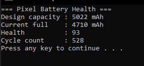 for /f i in ('adb shell cat /sys/class/power_supply/battery/charge_full') do set FULL=i for /f i in ('adb shell cat /sys/class/power_supply/battery/charge_full_design') do set DESIGN=i for /f i in ('adb shell cat /sys/class/power_supply/battery/cycle_count') do set CYCLES=i