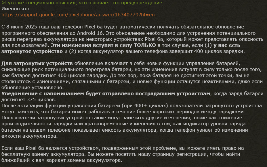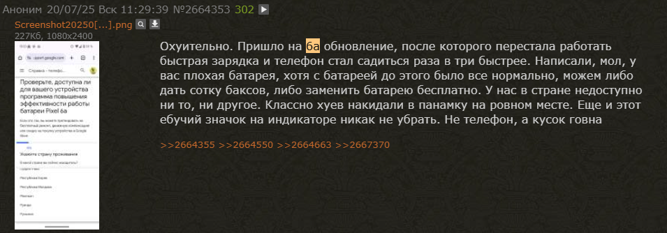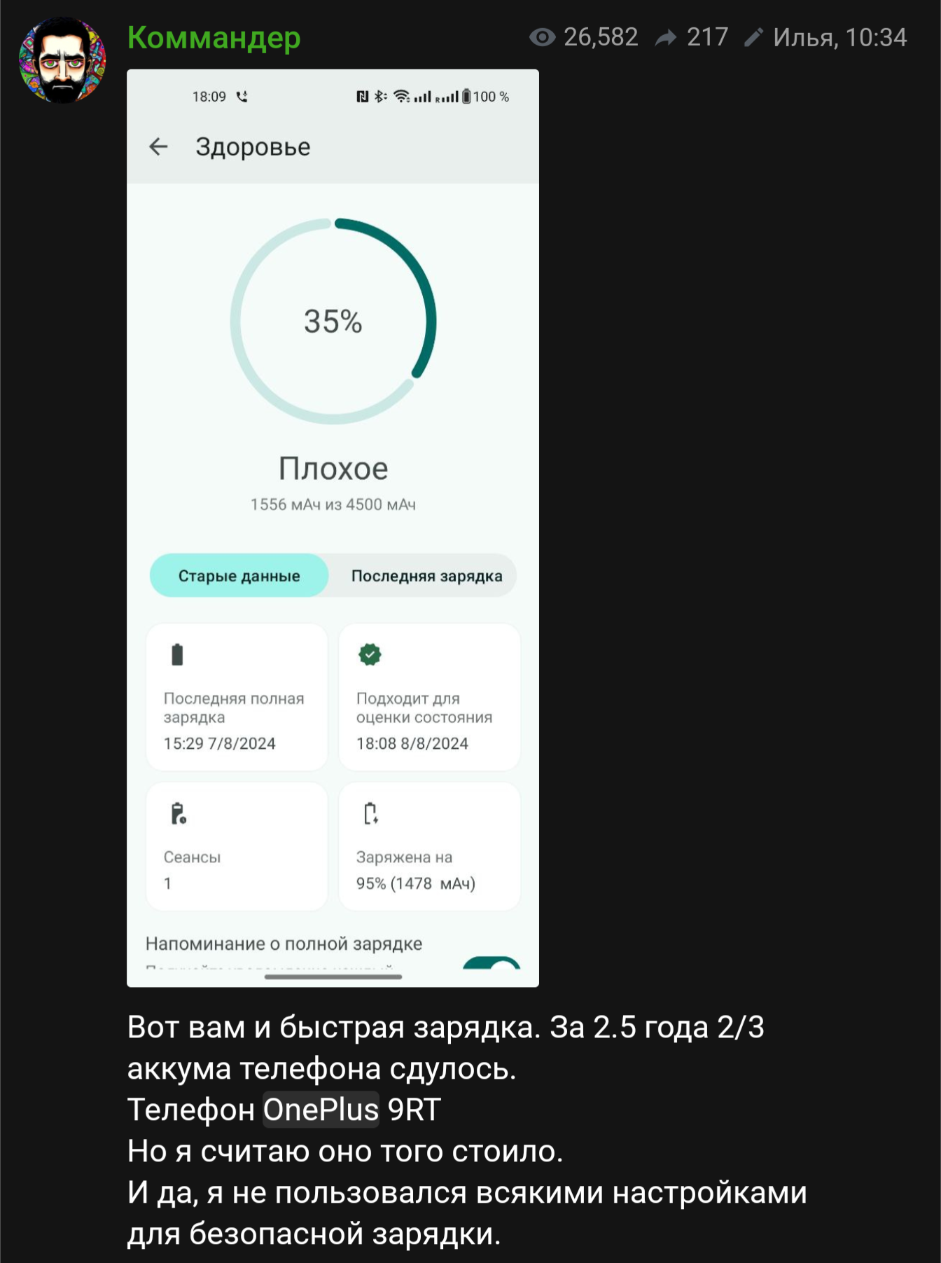 >>2699583 Я в курсе про этот гейт с батареей, тред не читал, да Читал на реддите и в коммах на ютубе что после замены батареи и сброса к заводским из системы пропадают упоминания о том что с батареей что-то не так, что ей пиздец и мы мол снижаем софтом ее ёмкость и скорость зарядки, что бы защитить ее И правда, когда я поменял и сбросил, все пропало, но по ощущениям мне все равно гугл подрезал ёмкость зачем-то,. Это уже жизнь после замены, твои скрины не очень актуальны