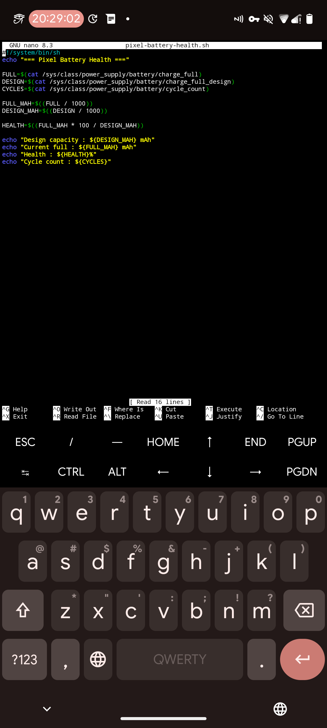 >>2693227 > Почему не сделать прямо в консольке на телефоне? Без адб или рута не получить доступ к инфе о батарее на пуках старее 8а, тупо репортится 100% при любом раскладе.