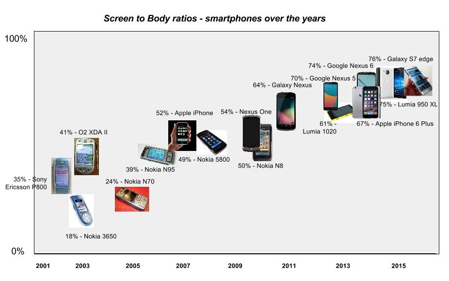 Раньше (2007-2011) больших смартфонов вообще не было, так что "кирпичей с микроэкраном" не существовало, а к появлению первых лопат (2012-2014) screen-to-body вырос до 70%, что уже не "микроэкран".