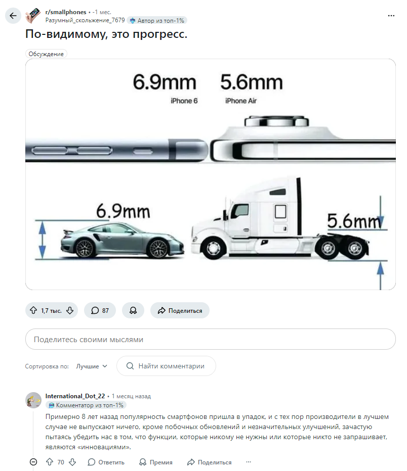 >>2687818 >Просто продажи оказались ниже, чем хотелось Apple нет, просто нет смысла париться, идти на компромисы, много работать над компоновкой, пихать мелкий аккум, когда это нужно полутора инвалидам с маленькими ручками я сам не любитель лопат, но и то чем вы тут занимаетесь - дрочево размеры 6,1 - 6,3 дюймовых телефонов аля iphone 16-17 или vivo X200 FE/Mini - идеальный компромис между компактностью и размером экрана/батареи