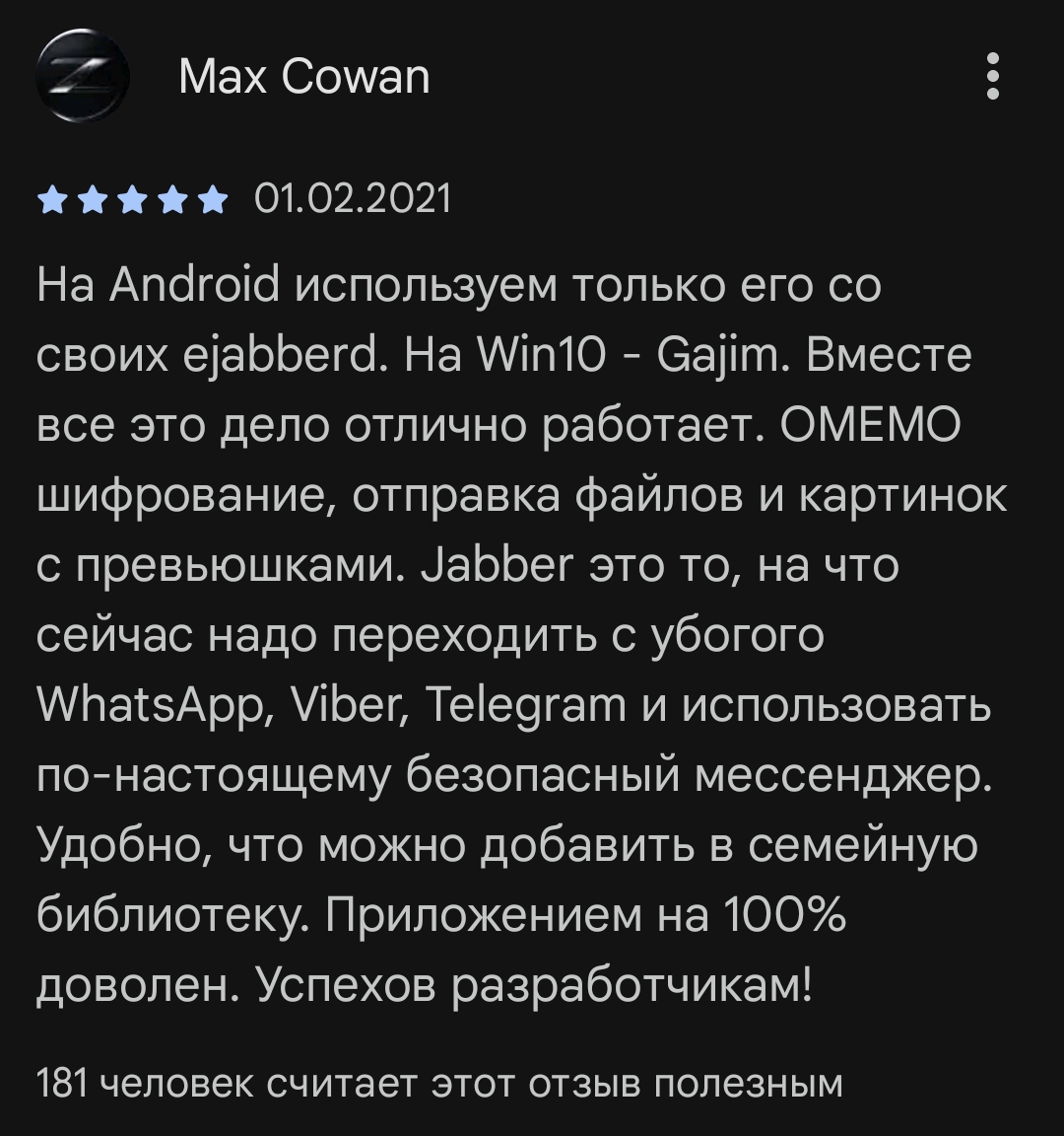 Почему поносят жаббер.ру? Что с ним не так? Зарегался, за все время использования было пару раз когда не работал сервер. Для параноиков сообщения все равно по дефолту через омемо. Это все равно лучше чем тотже скам. Опять таки яндекс поделился своими серверами, значит меньше шансов что заблокируют. При выкл интернетов у опсосов, при принудительном понижении сети с лте до 2, сервер джаббер.ру показал высокую скорость передачи сообщений при равных условиях с сити 404, также уделал телегу и вотсапп, хотя последние не совсем правильно сравнивать.