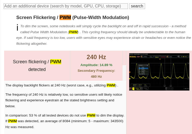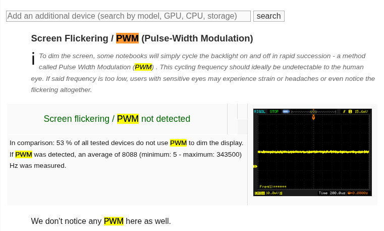 >>2703247 Продолжу далее, я спросил у AI типа такого: > Please find me table from notebookcheck.com site about PWM frequency and smartphones for flicker-sensitive persones (простите мой английский) И он мне тупо выдал базу: https://www.notebookcheck.net/PWM-Ranking-Notebooks-Smartphones-and-Tablets-with-PWM.163979.0.html Сверху годные для глаз смартфоны, вниз - похуже. Идея такая, что PWM Frequency должна быть либо ноль, либо наоборот, высокой, как вот этот >>2703389 написал, от 2000 кГц и выше.