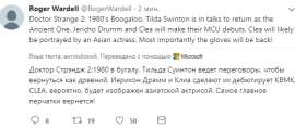 Тот самый парень из Твиттера по имени Roger Wardell, который ещё в декабре накидал жирные инсайды и утечки по «Финалу», которые в итоге оказались правдой, несколько часов назад опубликовал два новых твиттаИ вот их содержание:1) Доктор Стрэндж 2: Бугалу 1980-х. Тильда Суинтон ведёт переговоры, чтобы вернуться к роли Старейшины. Джерико Драмм (Доктор Вуду) и Клеа дебютируют в КВМ, на роль Клеи, скорее будет взята азиатская актриса. Самое главное, перчатки вернутся2) Создатель Ракеты — Высший Эволюционер. Дракса ждёт большой сюрприз, когда он узнает, что его дочь жива. У Ракеты также будет любовный интерес в виде Лиллы (любители фанфиков будут довольны), Небула и Звездный Лорд станут более близкими друзьями