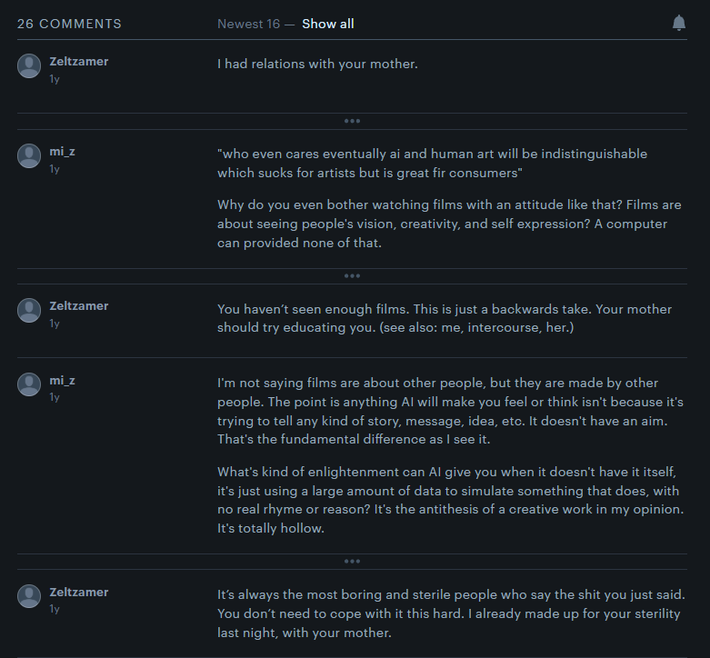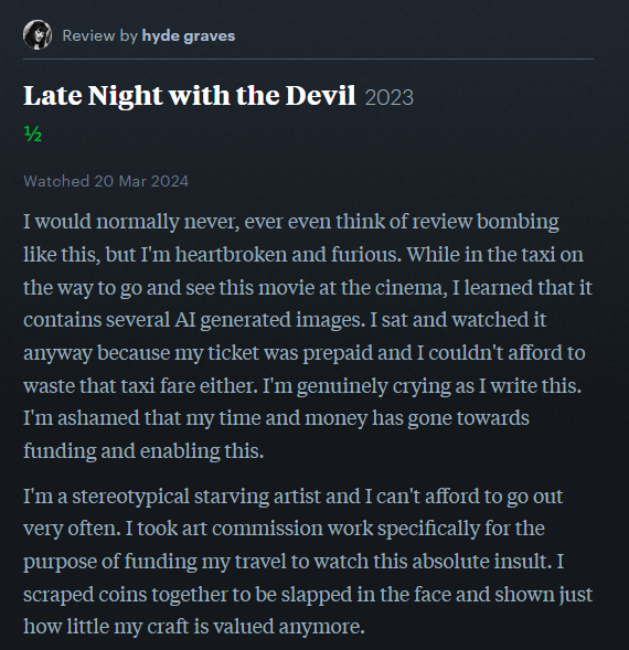 Хорошее развлекалово, но не будем о содержимом фильма, меня больше удивило другое - оказывается, там использовали несколько AI сгенерированных пикч для "please stand by" секций между ток-шоу (суммарно 5-10 секунд на весь фильм), из-за чего поднялся вой и ревью-бомбинг - ущемленные артисты оказались ВОЗМУЩЕНЫ. Вы в курсах о такой хуйне? Я чот пропустил лично.