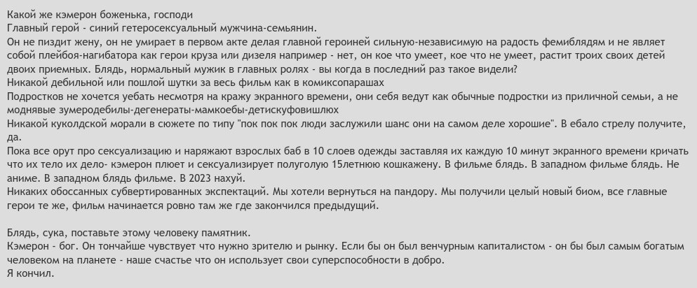 Каким бы хреновым с точки зрения реализма фильм не был, Аватар имеет право на существование. Он не ужасен, не несмотрибелен, в нем нет повестки, 90% каста - белые, актеров не набирают по квотам. Хотя бы за это стоит отдать камеруну должное. В нем охуенная операторская работа, пиздатые пейзажи, музыка. Во второй части это все сильно просело по всем фронтам - но походу слишком сильно торопились все доснять и не тянуть процесс еще пяток лет. Первую часть до сих пор пересматривал