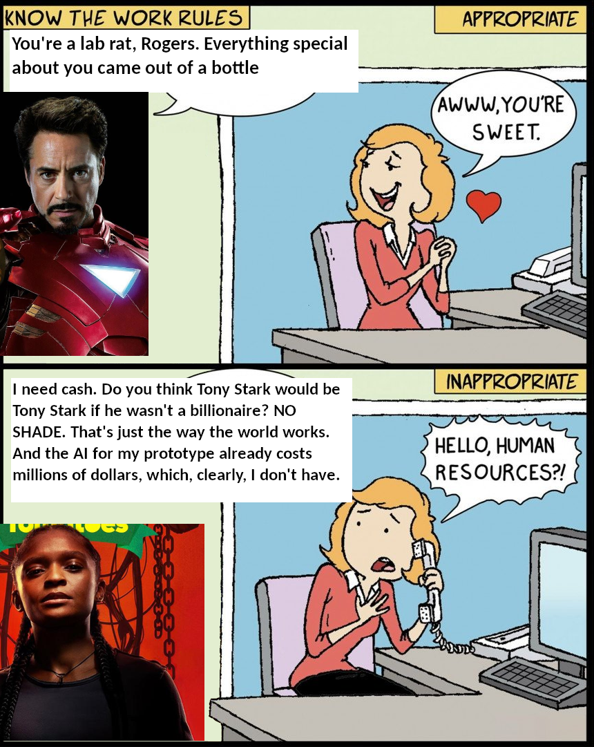 Целая комната голливудских сценаристов не смогла придумать, как негру шмурдяком проставиться, поэтому как есть гоняет. Причем блять , если в первом кэпе нам час реального времени мусолили, какой Роджерс пиздатый и на гранату прыгнет если что и айсикью больше 80, то негр просто охуенный по факту своего существования и ему все об этом сообщают. Ну и щит, вечный щит. Его редуцировали до фрисби, любой мимохуй за полчаса освоит. И да, ещё в армии США технику закрепляют за одним определенным человеком, спиздил костюм у жч? Теперь ты воитель! Подарили крылья? Ну сокол. Почему например нельзя просто забрать у него крылья и не отдавать? Он в них не спит. Из Роджерса так то проблематично шмурдяк откачать, а Старк в подвале новый костюм соберёт, с этими хуями именно приходится считаться.