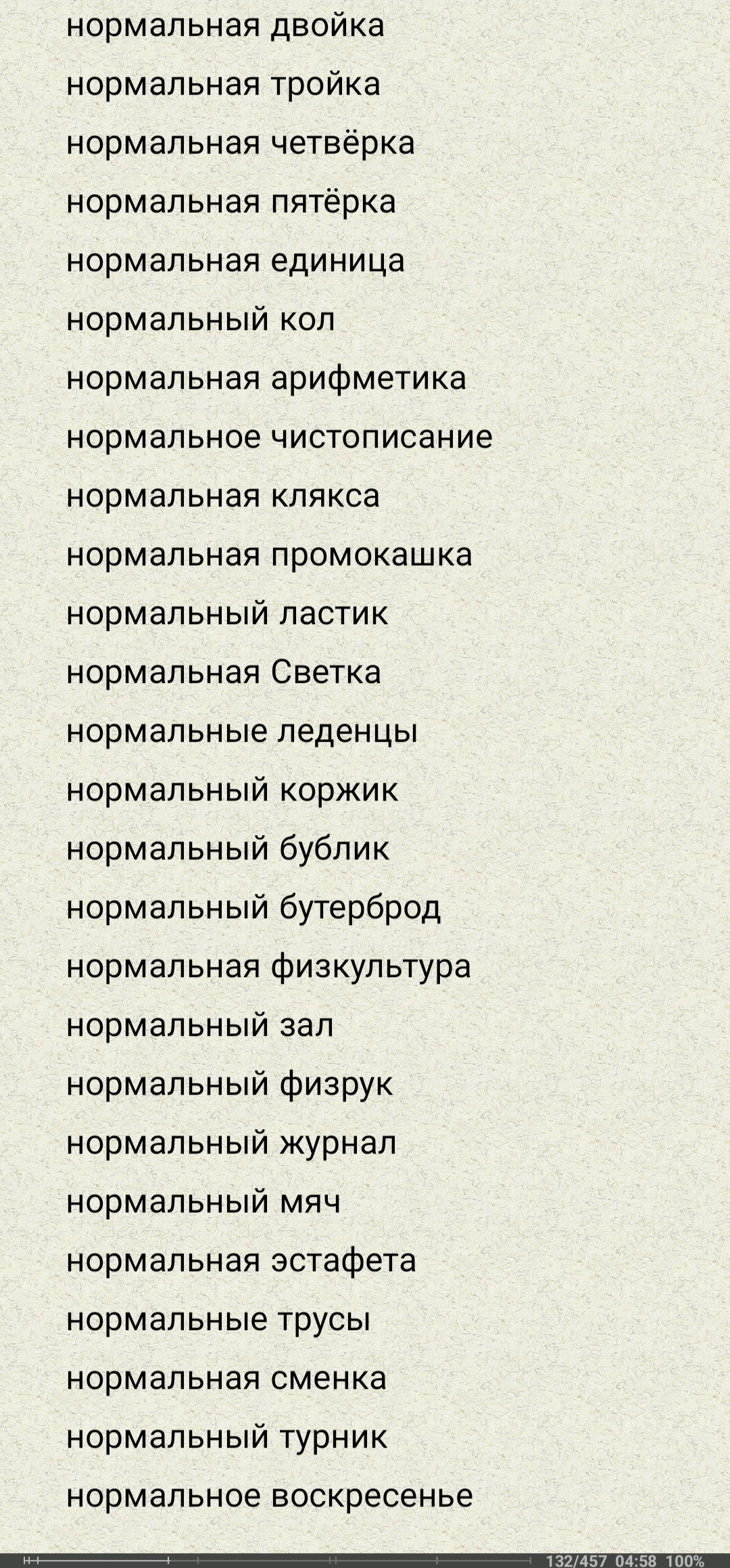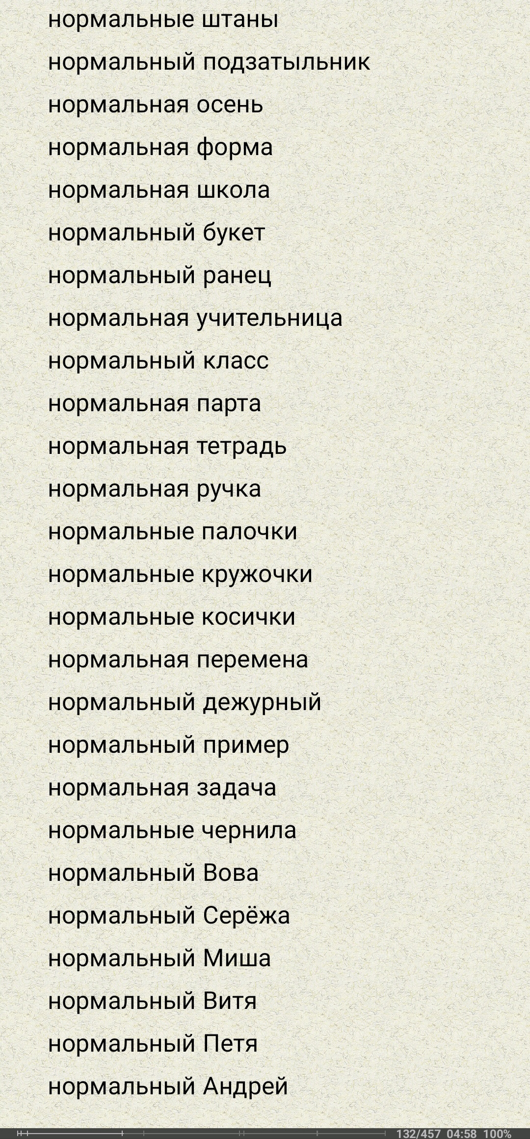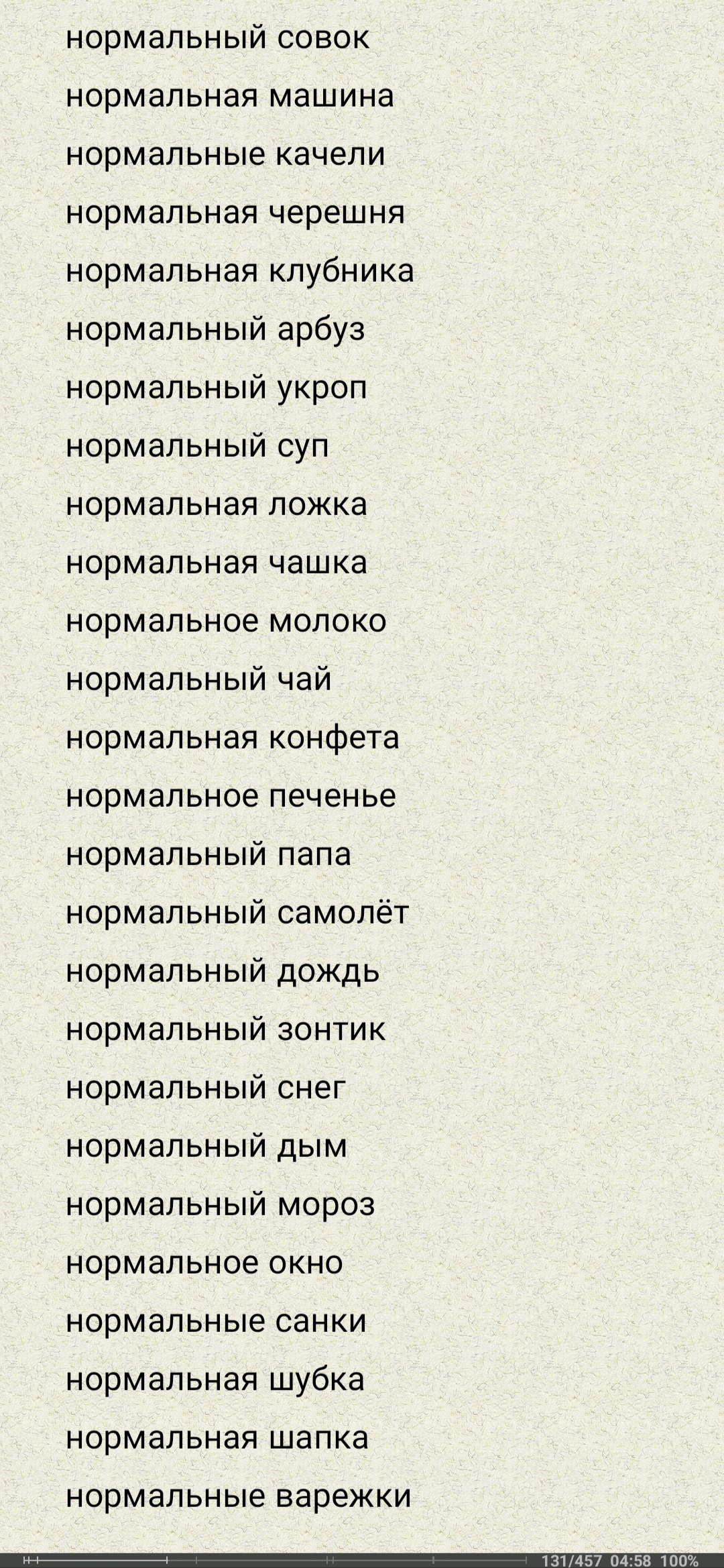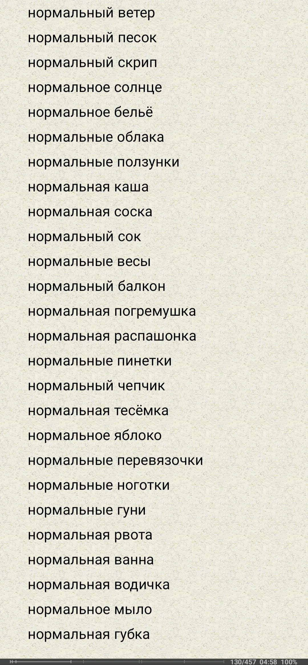 >>3740553 >>3741534 >>3741538 Если кто вдруг не читал, то поясняю. "Норма" там – это фабрично упакованная как сырок-творожок порция говна, и каждый гражданин обязан каждый день эту норму съедать. Так что когда рука тянется написать "нормальный человек, нормальные люди, а вот мы нормальные люди, а вот я нормальный человек", помните, что нормальный – это говняный. Не надо кичиться своей нормальностью, как чем-то примерным и образцовым.