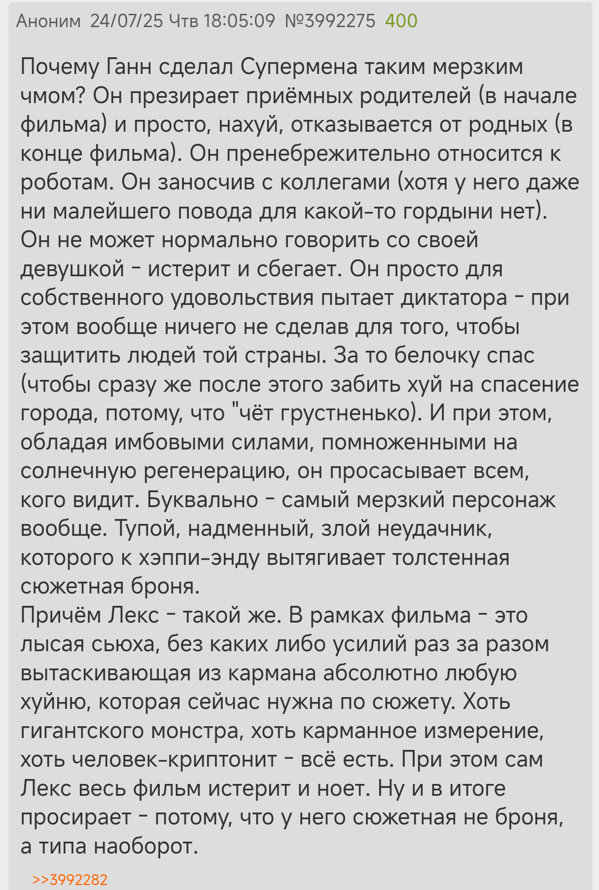 >>3996946 Причем здесь батлы? Есть три фильма в условном жанре супергероика (и еще новый капитан, он настолько дерьмо, что я забыл про него). Супермен просто лучше как развлекательное кино. В нем много экшена и он хорошо снят, этого достаточно чтобы отвлечь от сценарных проебов. Как фильм может среди этой тройки Громовержцы и получше, но это не делает его хорошим фильмом, это середяк, а как супергеройское кино он скучный так как персонажи ноунеймы и на них насрать. То есть ты заведомо шел на фильм с установкой что он говно? Типа: "Мне нужно засрать фильм, но чтобы все было честно сначала его посмотрю". Я хотя бы когда ФЧ смотрел надеялся что может быть что-то хорошее выйдет, к сожалению почти все мои опасения оправдались.