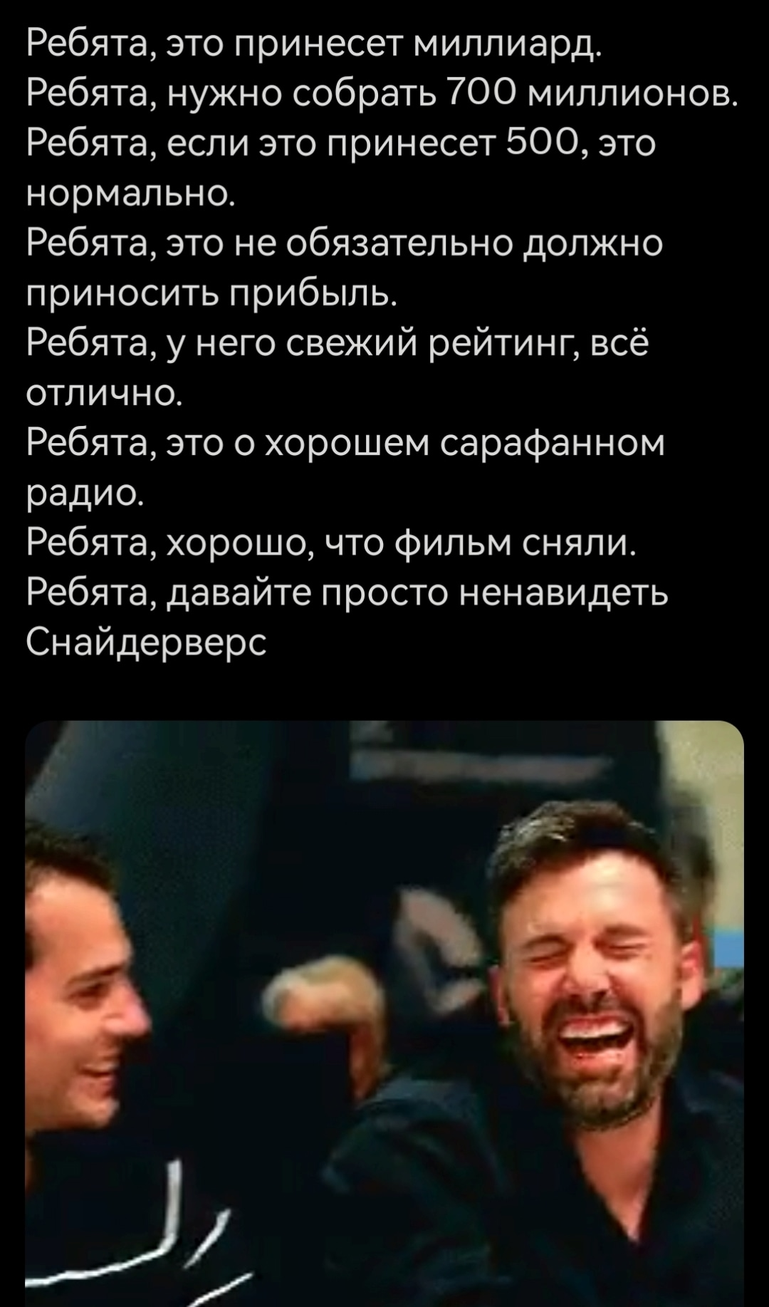 Другое дело что меня всё устраивает потому что 1) Снайдер Кат хотя бы вышел и есть трилогия нормального человека про нормального Супермена без намёка танна пародийность 2) Фильм очевидно не окупится , хотя это всё равно не остановит вб срать в себе в штаны в 13 блядь раз подряд, да и похуй зато смешно 3) русскоговорящие снова только выиграли так как никто не может на это свои кровные потратить