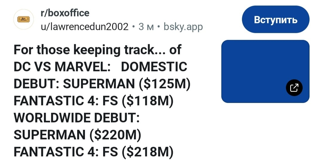 >>3994504 Пост с реддита До "Супермена" (2025) только 8 других фильмов показали результаты хуже на международном рынке, чем на рынке США/Канады. Три из них были первыми 3 фильмами MCU (что указывает на шаткое начало завоевания международного рынка). 2. Самая продолжительная непрерывная серия успешных международных кассовых сборов включала 15 фильмов за 6 лет, с мая 2011 года по май 2017 года. С тех пор у нас был хотя бы один фильм с плохими показателями каждые 3 года. 3. У DCEU на самом деле три ЛУЧШИХ фильма с высокими международными показателями. Оба фильма про Аквамена (вероятно, из-за звездной силы Джейсона Момоа или интереса к этому персонажу), а также "Чудо-женщина 1984" (НЕ результат реального значительного увеличения международной привлекательности, а скорее уменьшение посещаемости в США - посещаемость фильмов DCEU в США сократилась почти ВДВОЕ три раза подряд в фильмах, предшествовавших "ЧЖ84"). 4. "Золотой век" международной привлекательности, похоже, приходится на период с 2012 года ("Мстители") по 2020 год ("Чудо-женщина 1984"), когда в среднем 62,6% мировых кассовых сборов приходилось на международный рынок. В среднем для каждого фильма по комиксам с тех пор международный рынок составляет всего 54,9% от общей доли, что на почти 8% меньше. 5. НИ ОДИН из фильмов MCU после "Человека-паука: Вдали от дома" (официальное завершение Саги Бесконечности) не заработал более 59% своих сборов на международных рынках; многие фильмы во время Саги Бесконечности превышали 65% и даже приближались к 70%. 6. Если не учитывать выбросы MCU, и в дополнение к общей тенденции к снижению, доля кассовых сборов международных "провалов" со временем уменьшилась. От "Чудо-женщины" (49,9%) до "Черной пантеры" (49,1%), до "Шан-Чи" (48,1%), до "Черной пантеры 2" (47,2%) и, наконец, до "Синего жука" (44,6%) - "провалы" ухудшились примерно на 1% на каждый фильм. Мы видим больший скачок между "ЧП2" и "СЖ", а также еще больший разрыв между "СЖ" и "Суперменом", который в настоящее время имеет 40% международной доли.