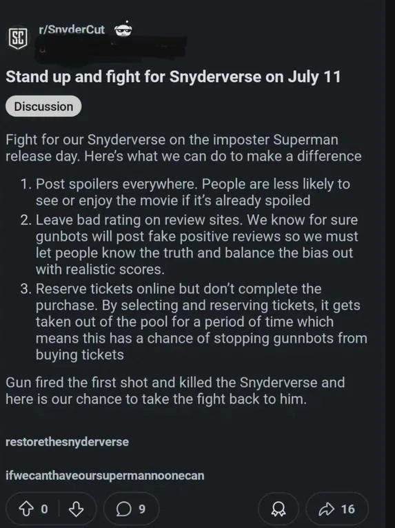 С ЭТОГО МОМЕНТА: 1) Называйте их только "фанатами Ганна". Это в итоге приведет обратно к самому Ганну, которому придется разбираться с негативом. 2) Говорите вещи вроде "Фанаты Ганна, которые травят людей за нелюбовь к их фильму, нашли этот пост." 3) Повторяйте слова "травля людей". 4) Используйте ключевые слова вроде "травля", "спонсируемый/оплаченный/брендовая/корпоративная марионетка", "расистская обезьянья гифка" 5) Не взаимодействуйте с очевидными провокациями (аккаунты, которые постоянно постят ложную дезинформацию вроде "Сцена в суде", "Торнадо Па Кента", "Лоис х Брюс" и т.д.) Их объясняли сотни раз. Они делают это специально. 6) Взаимодействуйте, ретвитьте и отвечайте позитивно на посты с благодарностью Снайдеру. 7) Под вашими постами о Снайдере взаимодействуйте ТОЛЬКО с позитивными комментариями, которые с вами согласны. Алгоритм увидит взаимодействие с позитивным контентом и будет распространять его вместо негативного. 8) Формулируйте ваши посты так, чтобы их мог понять любой обычный человек вне контекста. Вместо "Ганн не точен в комиксах", скажите "Ганн сделал отца Супермена злодеем". 9) Постите прямые сравнения скриншотов, разоблачающих ложь БЕЗ ПОДПИСИ. Фанаты DCU будут выглядеть токсично. 10) Постите активные утвердительные мнения, с которыми можно согласиться. (Вместо "Бэтфлек был не единственным Бэтменом, которого убили", скажите "Бен Аффлек был самым кинематографичным Бэтменом за все время!") 11) Не спамьте/не создавайте хештеги. У них теперь плохая репутация.
