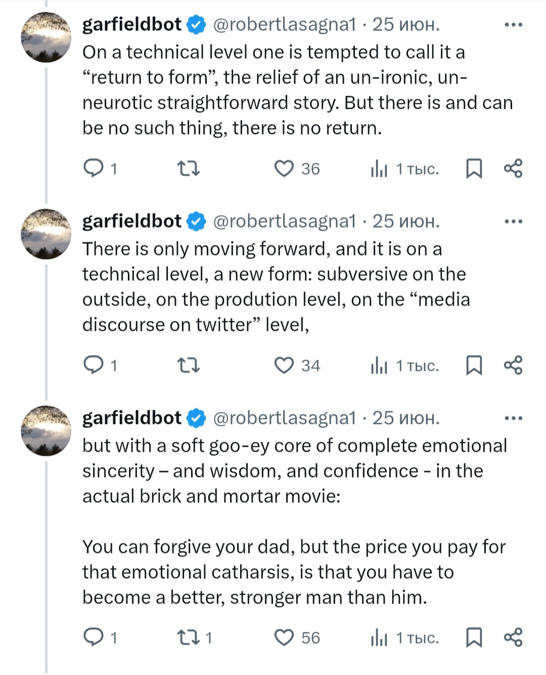 А может комментарии на рутубе и остальных площадках к этому фильму это так сказать обкатка какой-нибудь полит-промывочной технологии, чтобы менять мнения людей, максимальная промывка, чтобы выдать черное за белое и наоборот?? Половина комментариев написана в ботском стиле. А этот фильм выбрали как тестовый, ну и плюс англосаксы сатанисты конечно-же сняли