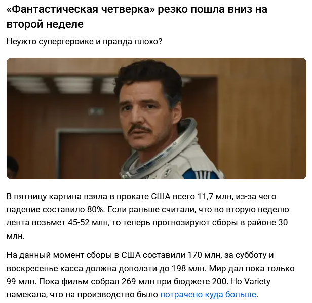 Как я и думал. На первой неделе ФЧ пошли смотреть любители комиксов, те кто хотел увидеть Дума, те кто повелся на хорошие обзоры, но кассу делают подпивасы. А фильм совсем не подпивасный, слишком скучный.