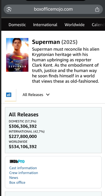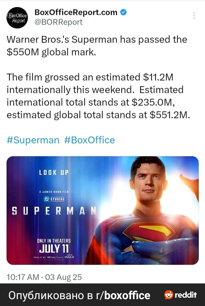 Красиво в этом году падают фильмы: Супермен (551 на этих выходных уже), 3 фильма Марвел (368 F4, “Captain America: Brave New World” ($415 million globally) and “Thunderbolts” ($382 million globally). , Миссия (592)