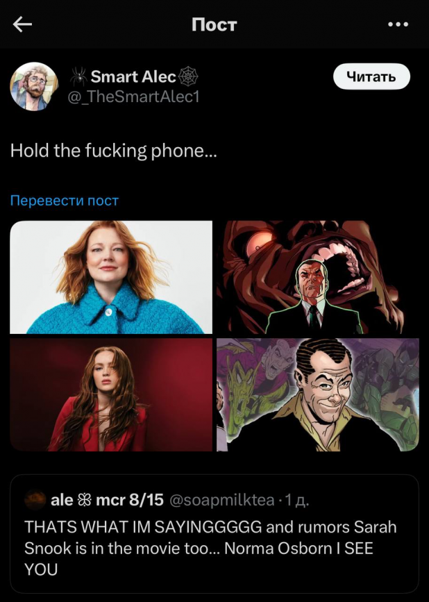 Карателю в новом ЧП должны дать старую броню Воителя иначе ему никак не совладать с мета-людьми. Кто то там заявил что вселенную Сони уничтожит Дум, но если они не вытянут от туда нормально персонажей с достаточно грамотным кастом то это будет просто позор. Про заяву Руссо про войну миров наверно имеется ввиду съемку событий на телефон от нормисов. Скорее всего будет типо реакшен от Дэдпула на события в фильме в сцене после титров или типо того. Тут и Рейнольдс уже хайпить начал.