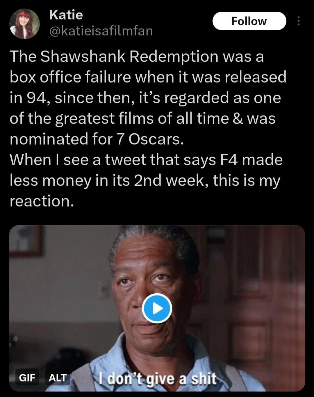 «Я сходил на показ „Фантастической четвёрки“ в 5 часов вечера в местном зале IMAX. Как вы видите, зал пустой. Я могу сказать вам, почему вокруг фильма так мало шумихи. Он невероятно скучный и унылый», — написал Роберт Лайфелд.