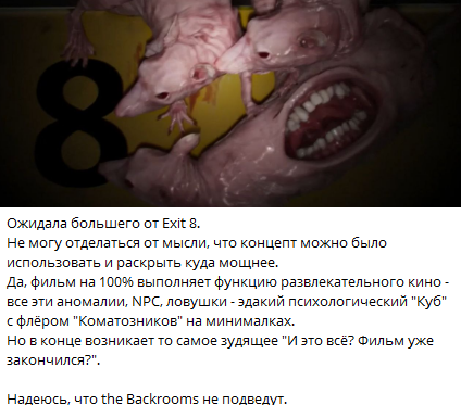 Ожидал большего от Exit 8. Не могу отделаться от мысли, что концепт можно было использовать и раскрыть куда мощнее. Да, фильм на 100% выполняет функцию развлекательного кино - все эти аномалии, NPC, ловушки - эдакий психологический "Куб" с флёром "Коматозников" на минималках. Но в конце возникает то самое зудящее "И это всё? Фильм уже закончился?".