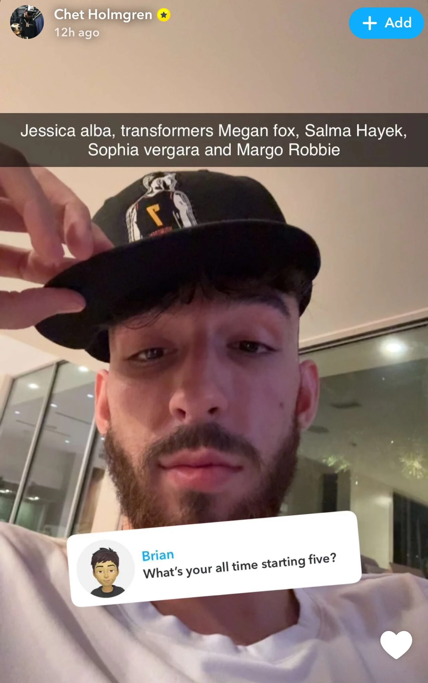 Во время общения с фанатами в Snapchat Холмгрен решил назвать свою «стартовую пятерку всех времен». Фанаты ожидали легенд НБА вроде Майкла Джордана, Леброна Джеймса или Карима Абдул-Джаббара.