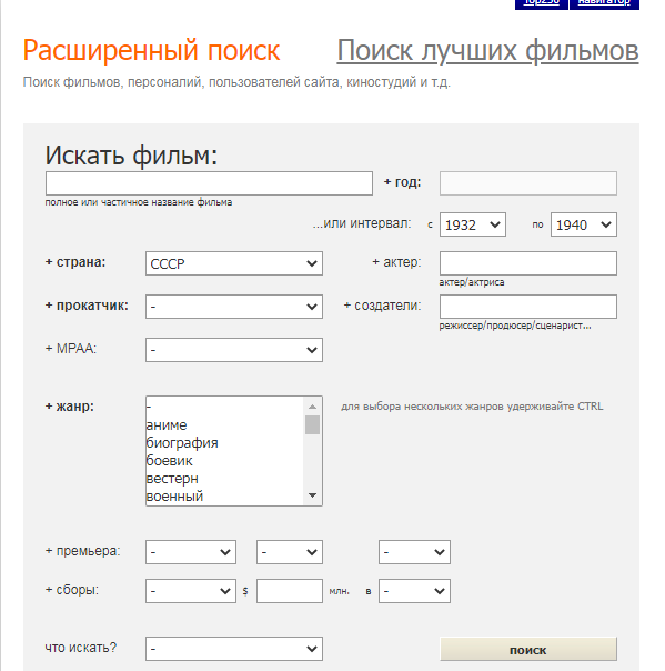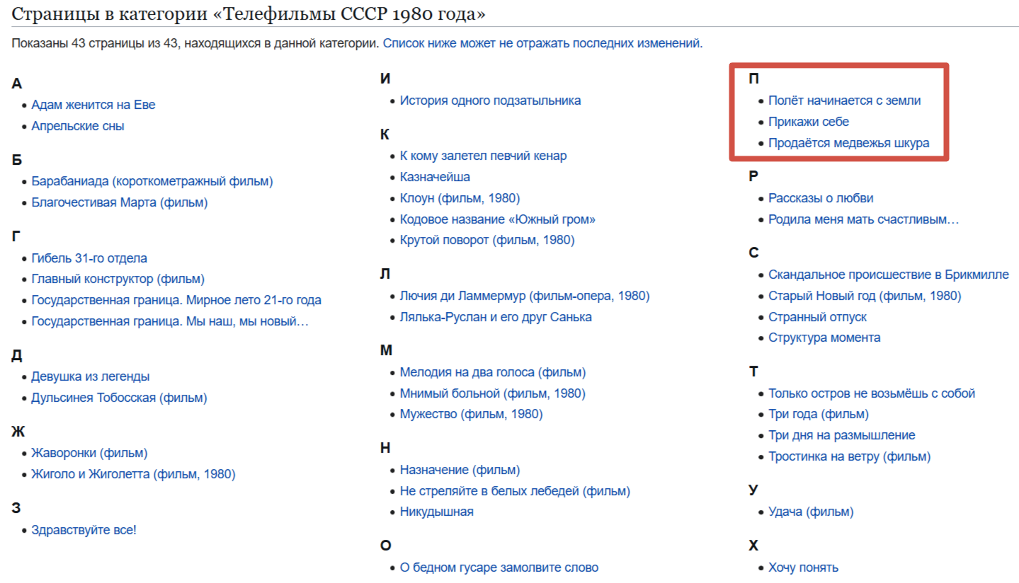 Существует ли какой-нибудь сайт, на котором записаны все российские и советские фильмы, когда-либо выходившие, чтобы их можно было смотреть по годам? Как на пукиведии, но на ней явно не все фильмы собраны. Например, вторая часть Шерлока Холмса с Ливановым в соответствующем списке отсутствует; если уж такую ультрапопулярную ленту ленту забыли включить в перечень, то что говорить обо всякой обскурщине. ИМДБ и Кинопоиск не подходят, потому что там нельзя именно листать по годам фильмы одной страны.