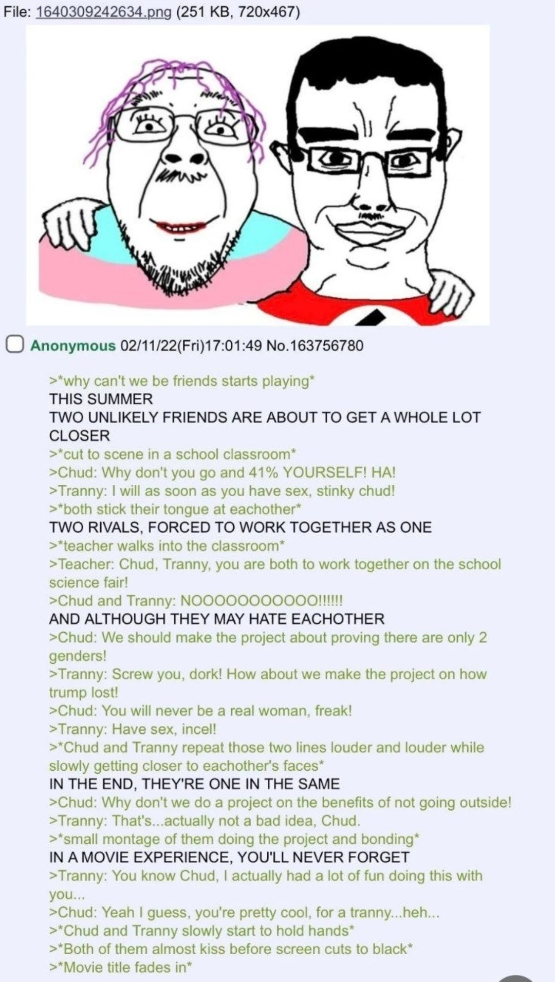 Лично я бы снял трагикомедию про отношения двачера-инцела и феминистки. В начале картины они были бы представлены скорее как карикатурные персонажи, но по ходу картины усложнялись бы и становились похожи на реальных людей. Также добавил бы интересных второстепенных персонажей. Например, у двачера будет циничная и грубая бабушка, в стиле "Похороните меня за плинтусом", которая окажется прикована к постели из-за неизлечимой болезни, либо после ампутации конечности. Герою придется ухаживать за ней, а в этом ему будет помогать фемка, у которой, допустим, имеется медицинское образование. Ну и в конце фильма бабушка умирает, а герои расстаются. Никакого хэппи-энда.